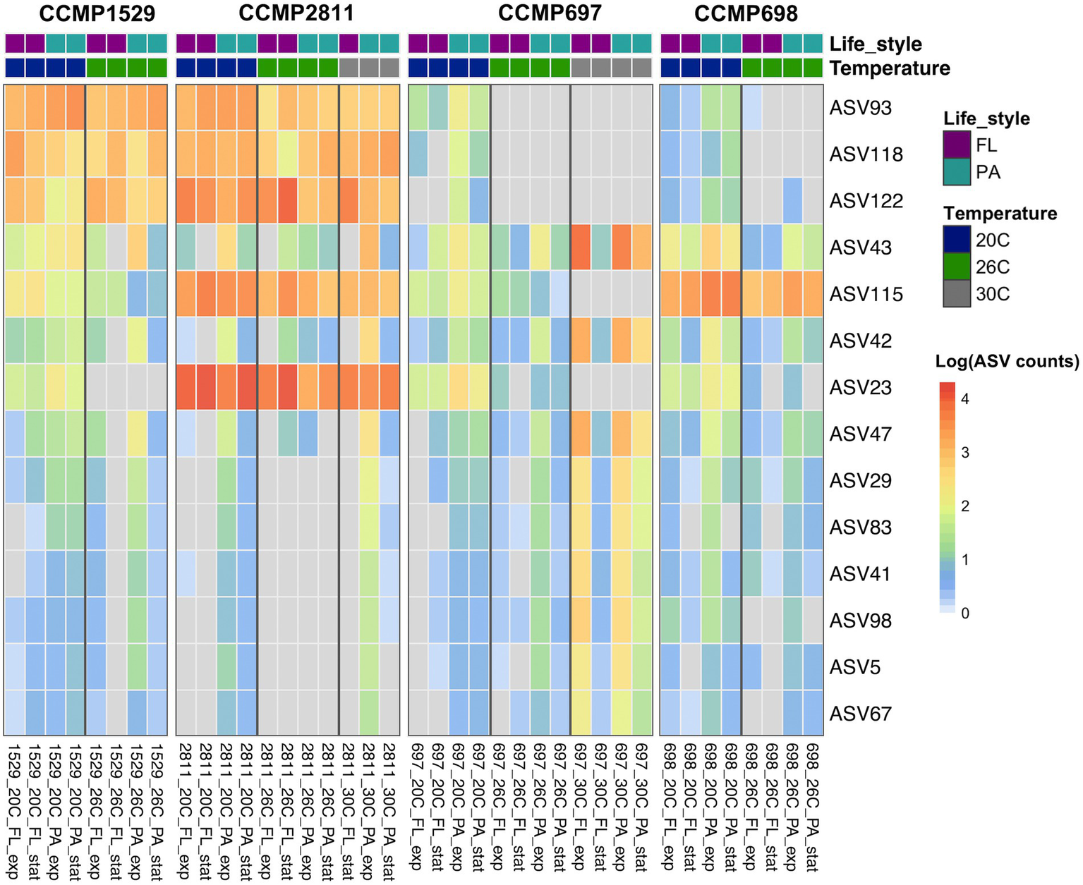 Abundance of all ASVs detected in four xenic strains of Prorocentrum cordatum. at different conditions and temperatures. The heatmap shows the hierarchical clustering of ASVs based on their abundances, expressed as log(1 + x). After AMCOM-II preprocessing, white squares correspond to “structural zeros” (lack of ASVs) and gray squares to “sampling zeros” (zeros due to abundance below detection limit/sequencing depth; Kaul et al., 2017). The average AVS abundance was calculated from two or three biological replicates for each strain at each condition, where the colors in the first row indicate lifestyle and the ones in the second-row temperature.