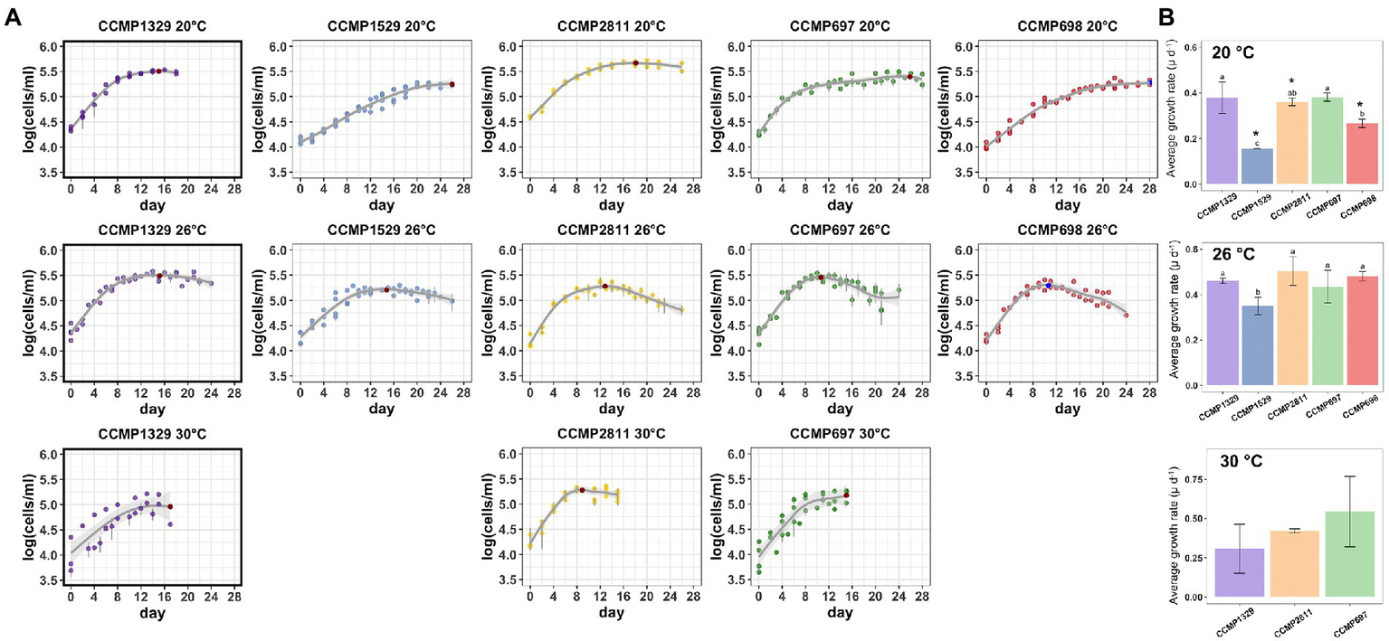 The xenic strains of P. cordatum CCMP697, CCMP698, CCMP1529, and CCMP2811 and the axenic strain CCMP1329 were obtained from the Provasoli-Guillard National Center for Marine Algae and Microbiota (NCMA, formerly the Provasoli-Guillard National Center for Culture of Marine Phytoplankton, CCMP). Date and place of isolation for each strain can be found in Table 1. After arrival at our lab, the P. cordatum isolates were cultured for at least 4 transfers (around 2 months) at 20°C to acclimatize them to our culture conditions before growing them at 26°C and 30°C.