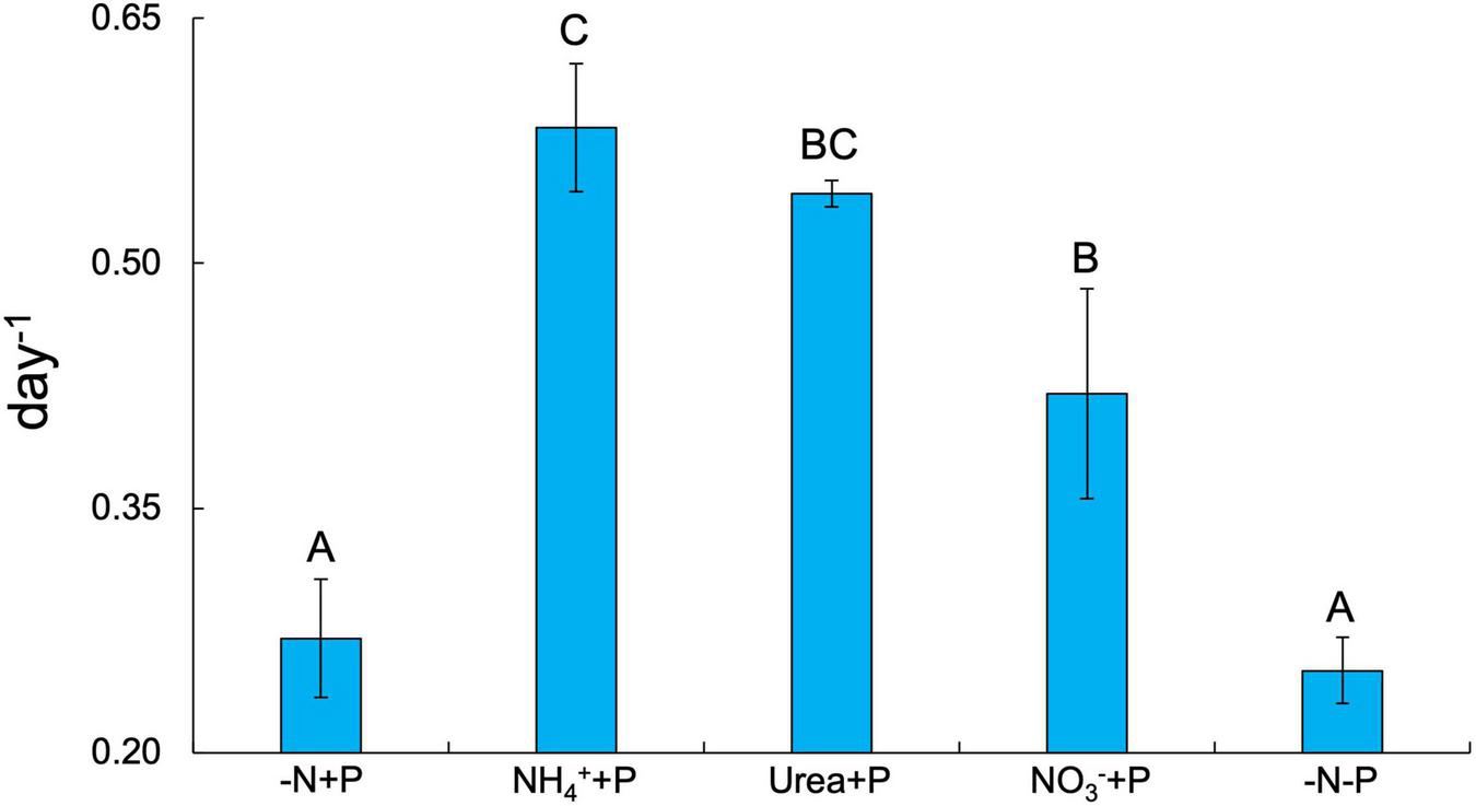 Maximum growth rates (μmax; day–1) across all experimental groups. Error bars represent standard deviation. Letters above bars represent significant differences between experimental groups (Two-way ANOVA; Tukey’s HSD post hoc; p < 0.05).