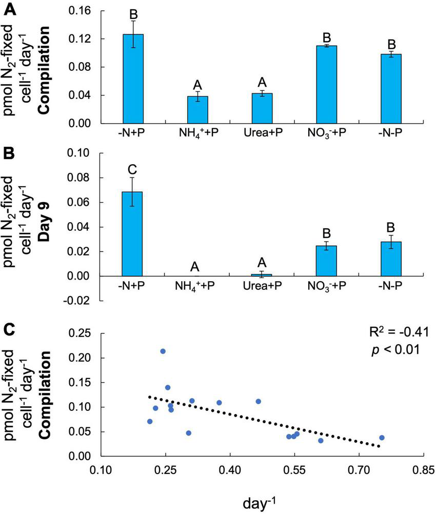 N2 fixation rates normalized to cell density (pmol N2-fixed cell–1 day–1). (A) N2 fixation rates on days 1, 3, 5, and 9 averaged. (B) Final timepoint (day 9) N2 fixation rates. Letters above bars represent significant differences between experimental groups (Two-way ANOVA; Tukey’s HSD post hoc; p < 0.05). (C) N2 fixation as a function of maximum growth rate (μmax; day–1). Values in the upper right-hand corner represent the coefficient of determination (R2) and the significance (p-value) of the linear regression.