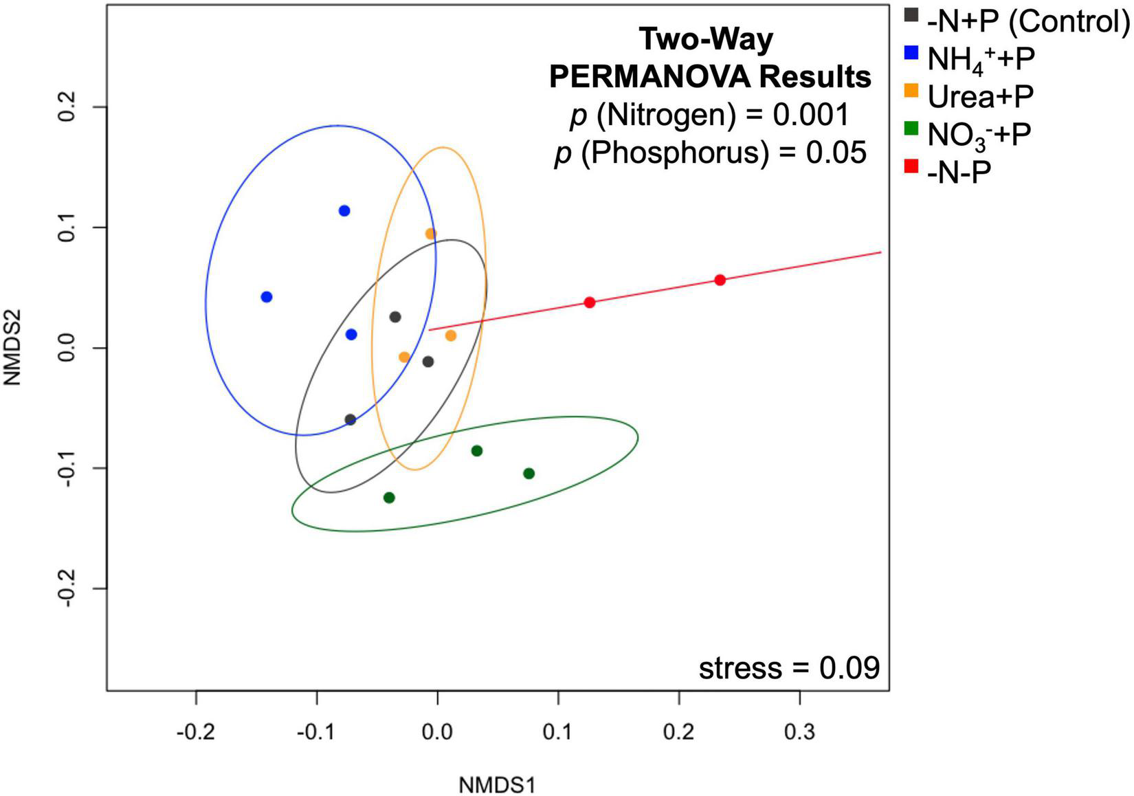 Non-metric multi-dimensional scaling (nMDS) plot of normalized read counts among treatments mapped to the Trinity assembly. Stress value in the lower left-hand corner indicates the disagreement between the plot configuration and the predicted values from the regression. Ellipses represent 95% confidence intervals, with the results of a two-way PERMANOVA (p < 0.05) on the dissimilarity matrix of the data presented in the upper right-hand corner, representing the significance of fixed nitrogen and phosphorus availability on relative differences.