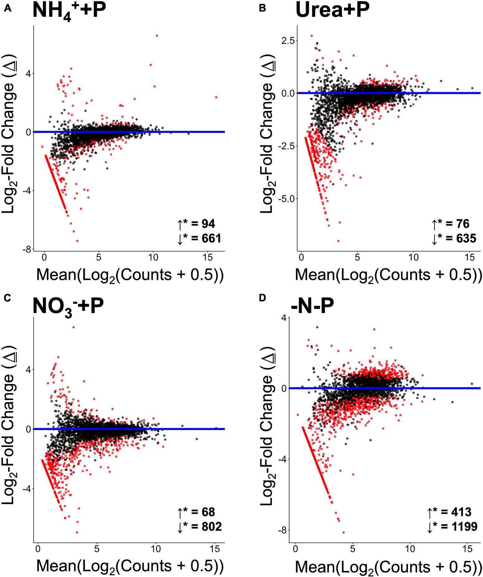 MA plots representing log2-fold changes (Δ) in gene expression of experimental treatments [(A) = NH4+ + P, (B) = Urea + P, (C) = NO3– + P, (D) = −N-P) relative to the control (−N + P). Change is plotted relative to base mean expression of gene transcripts normalized, log2-transformed, annotated and aggregated relative to KO numbers. Significantly differentially upregulated (↓*) genes and downregulated (↓*) genes are indicated directly above the x-axes. Gene transcripts exhibiting statistically significant differences in expression (False Discovery Rate/qval < 0.05) are colored red. Statistical analyses were performed in Sleuth using the Wald test.