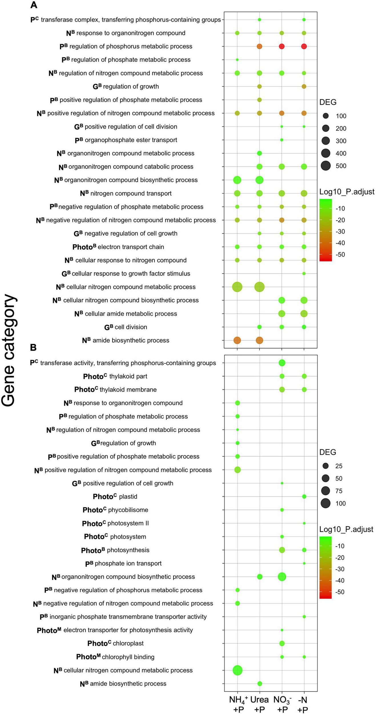 Differentially expressed categories of genes [(A) = 4-fold downregulated, (B) = 4-fold upregulated] relative to the control (−N + P). Results are from transcript-based Gene Ontology (GO) enrichment analysis. The significant differential expression of genes was determined using Sleuth (Wald test; qval < 0.05), and gene categories were tested for significant differential expression using GOenrich (hypergeometric distribution analysis; padj < 0.05). Padj values were Log10-transformed for scaling purposes, and green - red colorations corresponded to lower - higher degrees of significance. Gene categories plotted were those associated with nitrogen (N) and phosphorus (P) assimilation, growth (G), as well as photosynthesis (Photo), while superscripts correspond to biological (B), cellular (C), and molecular (M) gene categories. The number of differentially expressed genes (DEGs) in gene categories are represented by circle size.