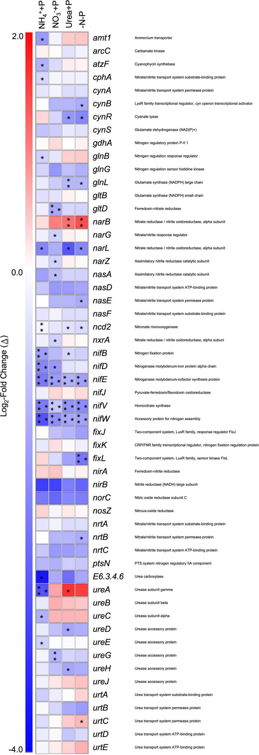 The number of transcripts for ureA, which encodes for a subunit of urease, and urtC, which encodes for the urea transport system permease, significantly (Wald test; qval < 0.05) increased in the transcriptomes of NO3– + P (Δ≅ + 1.60) and −N-P (Δ≅ + 0.58), respectively, relative to the control (−N + P; Figure 8). In contrast, ureA exhibited a significantly lower number of transcripts in the transcriptomes of NH4+ + P (Δ≅−2.68, qval < 0.001), as did ureC (Δ≅−1.23, qval < 0.05), and other genes that encode for enzymes associated with urea degradation, namely atzF (allophonate hydrolase; Δ≅−1.20, qval < 0.05) and E6.3.4.6 (urea carboxylase; Δ≅−3.62, qval < 0.05). Significant differential expression (Δ≅−1.58, qval < 0.05) of amt1, which encodes for an ammonium transporter, was only observed in the transcriptomes of NH4+ + P, with transcripts being lower in abundance. Other N metabolism genes that were differentially expressed include cphA, which encodes for cyanophycin synthetase, exhibited a significantly lower number of transcripts in the transcriptomes of NH4+ + P (Δ≅−0.67, qval < 0.05), as well as genes that encode for cyanase, cynB (Δ≅−1.31, qval < 0.05) and cynR (Δ≅−1.88, qval < 0.05), which exhibited significantly lower transcripts in the transcriptomes of −N-P. The number of transcripts for glutamine synthetase-encoding genes (gln) was significantly lower in the transcriptomes of NH4+ + P (glnB; Δ≅−0.70, qval < 0.05), NO3– + P (glnL; Δ≅−1.12, qval < 0.01), and −N-P (glnL; Δ≅−1.13, qval < 0.05), while gltD was the only gene involved in glutamate synthesis to exhibit a significantly lower transcript abundance, specifically in the transcriptomes of urea + P (Δ≅−1.35, qval < 0.001). Significantly lower numbers of transcripts (Wald test; qval < 0.001) of nifE, nifV, and nifW, which encode for nitrogenase subunits, were observed in all experimental treatments (Figure 8). Significantly lower numbers of transcripts of nifB (Δ≅−1.52, qval < 0.001) and nifD (Δ = −1.88, qval < 0.001) were observed in NH4+ + P, while the former and latter genes were present at significantly lower transcript abundances in NO3– + P (Δ≅−0.64, qval < 0.05) and urea + P (Δ≅−1.62, qval < 0.05), respectively, compared to the control. Finally, the transcriptomes of −N-P exhibited significantly lower transcript abundance of fixL (Δ≅−2.15, qval < 0.001; Figure 8), which encodes for a putative oxygen sensor.