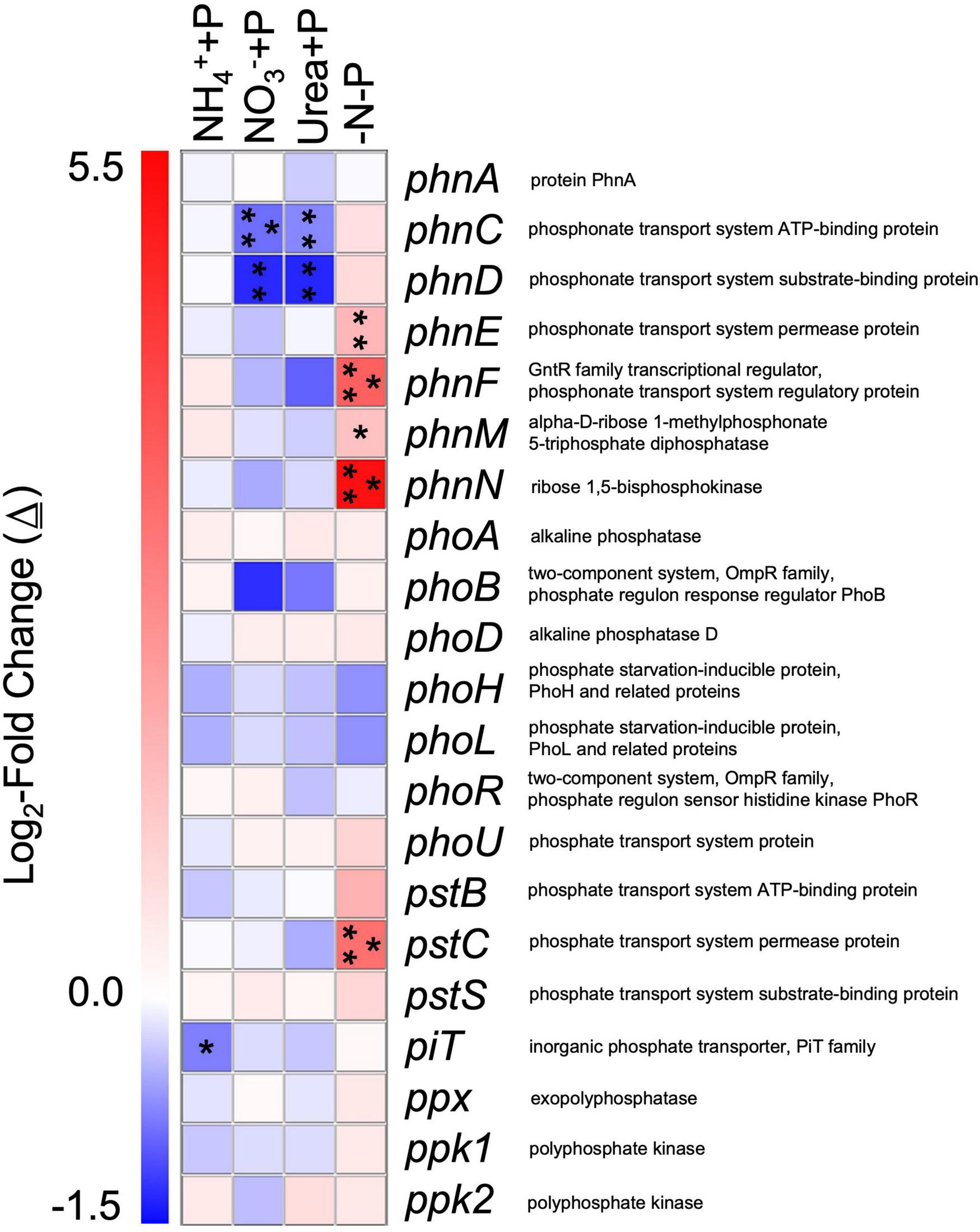 Genes associated with phosphorus (P) assimilation that were differentially expressed relative to the control (−N + P) included those that belong to the phn, pho, and pst clusters (Figure 9). For cultures amended with fixed N, genes that exhibited a significant change (Wald test; qval < 0.05) in transcript abundance were always lower than those of the control, while the transcriptomes of −N-P were the only ones to exhibit a significantly greater number of transcripts relative to the control, specifically for four phn genes and pstC (Figure 9). While non-significant, polyphosphate synthesizing (ppk1, Δ≅ + 0.47) and degradation (ppx, Δ≅ + 0.49) – encoding genes also exhibited the highest average increase in transcript number in the transcriptomes of −N-P than any other treatment relative to the control (Wald test; q > 0.05; Figure 9).