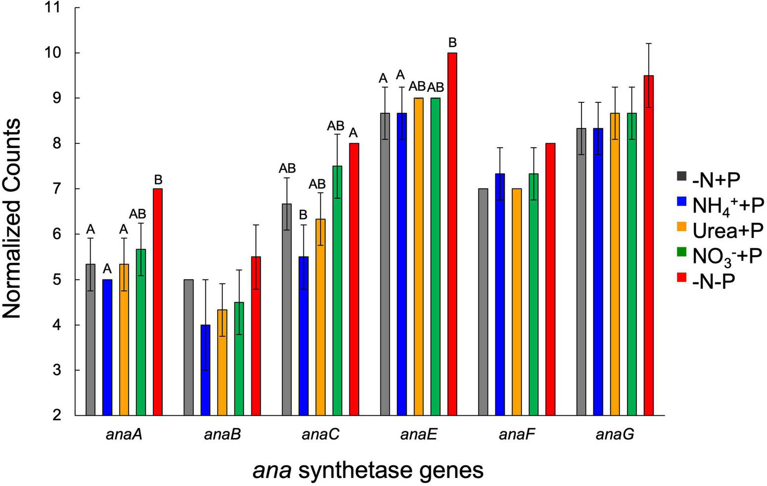 Expression (normalized counts) of genes involved in anatoxin synthesis across treatments at the final timepoint (day 9). Error bars represent standard deviation. Letters above bars represent significant differences between experimental groups (Two-way ANOVA; Tukey’s HSD post hoc; p < 0.05).