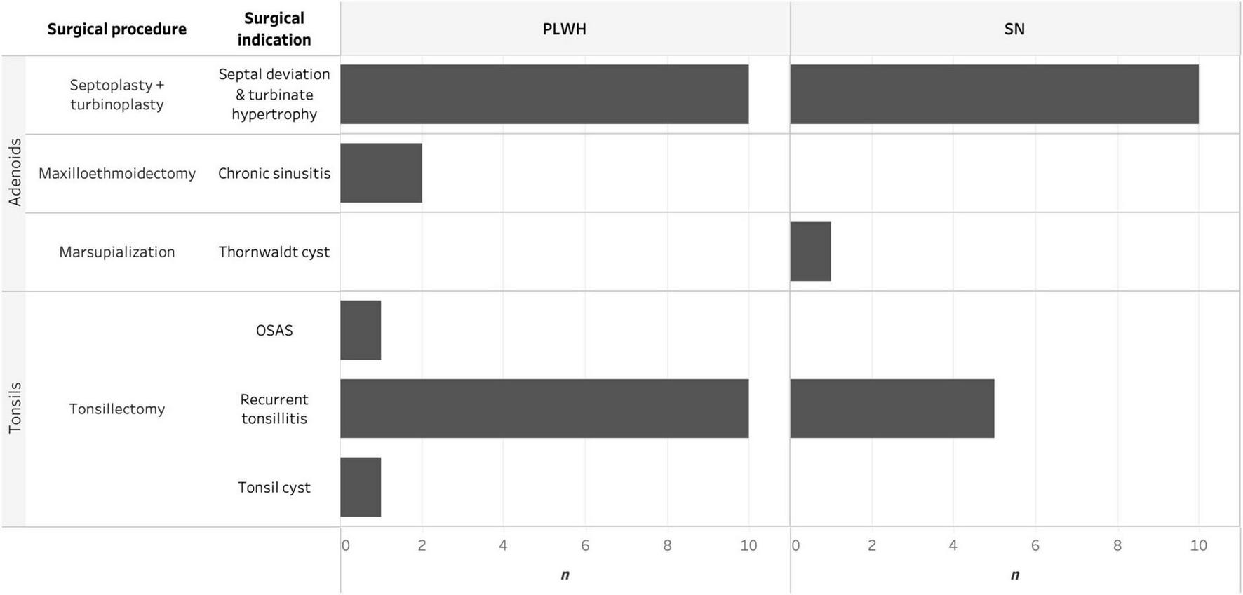 Histogram depicting the surgical procedure and surgical indication for adenoidectomy and tonsillectomy faceted by HIV status and anatomical site. HIV, human immunodeficiency virus; OSAS, obstructive sleep apnea syndrome; PLWH, people living with HIV; and SN, seronegative.