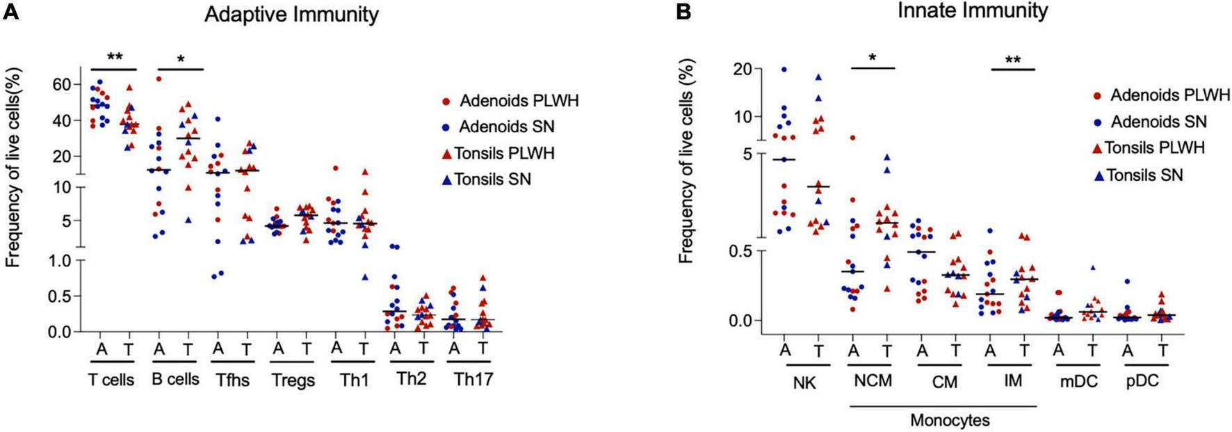 Adenoids and tonsils have similar frequency of adaptive and innate immune cells. Adenoids and tonsils were obtained from PLWH and SN. The frequency (%) of adaptive and innate immunity cells were assessed by flow cytometry. (A) The frequencies (%) of T cells (CD3+), B cells (CD19+), and CD4+ T cells subpopulations: Tfhs (CD3+CD4+CD45RO+CXCR5+), Tregs (CD3+CD4+CD45RO+CD25+FOXP3+), Th1 (CD3+CD4+CD45RO+T-bet+), Th2 (CD3+CD4+CD45RO+CRTH2+), and Th17 (CD3+CD4+CD45RO+RORgt+) are shown. (B) The frequencies (%) of NK cells (CD56+), macrophages (classical CD14- CD16+, non-classical CD14+ CD16- and inflammatory CD14+ CD16+ HLADR-) and dendritic cells (myeloid dendritic cells CD123- CD11c+ and plasmacytoid dendritic cells CD123+ CD11c-) are shown. Scatter plots were used to present the data. The median is shown by a horizontal line. Each symbol represents one individual. Red triangle: PLWH tonsils, red circle: PLWH adenoids, blue triangle: SN tonsils, and blue circle: SN adenoids. Data was compared using the Wilcoxon Rank Sum test. Only p values < 0.05 are shown in the graphs. *p < 0.01; **p < 0.001. %, frequency; CM, classical macrophages; CRTH2, chemoattractant receptor-homologous molecule expressed on TH2 cells; FOXP3, forkhead box P3 protein; HIV, human immunodeficiency virus; IM, inflammatory macrophages; mDC, myeloid dendritic cells; pDC, plasmacytoid dendritic cells; PLWH, people living with HIV; NCM, non-classical macrophages; NK, natural killer; RORgt, retinoic acid-related orphan receptor-gammat; SN, seronegative; Tfhs, T follicular helper cells; Th, T helper; and Tregs, T regulatory.