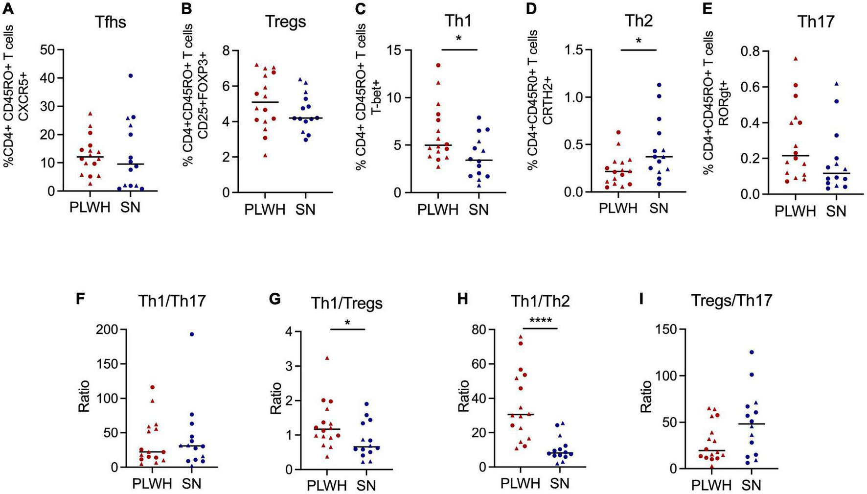 PLWH have increased frequency of Th1 and decreased of Th2 compared to SN. Adenoids and tonsils were obtained from PLWH and SN. Cells from both anatomical sites were pooled to represent the NALT. The frequency (%) of CD4+ T cell subpopulations was assessed by flow cytometry. The frequency of (A) Tfhs (CD3+CD4+CD45RO+CXCR5+), (B) Tregs (CD3+CD4+CD45RO+CD25+FOXP3), (C) Th1 (CD3+CD4+CD45RO+T-bet+), (D) Th2 (CD3+CD4+CD45RO+CRTH2+), and (E) Th17 (CD3+CD4+CD45RO+RORgt+) are shown. The ratios of (F) Th1/Th17, (G) Th1/Tregs, (H) Th1/Th2, and (I) Tregs/Th17 were also determined. Scatter plots were used to present the data. The median is shown by a horizontal line. Each symbol represents one individual. Red triangle: PLWH tonsils, red circle: PLWH adenoids, blue triangle: SN tonsils, and blue circle: SN adenoids. Data was compared using the Wilcoxon Rank Sum test. Only p values < 0.05 are shown in graphs. *p < 0.01; **p < 0.001. %, frequency; CRTH2, chemoattractant receptor-homologous molecule expressed on TH2 cells; FOXP3, forkhead box #P3 protein; HIV, human immunodeficiency virus; PLWH, people living with HIV; NALT, nasopharyngeal-associated lymphoid tissue; RORgt, retinoic acid-related orphan receptor-gammat; SN, seronegative; Tfhs, T follicular helper cells; Th, T helper; and Tregs, T regulatory.