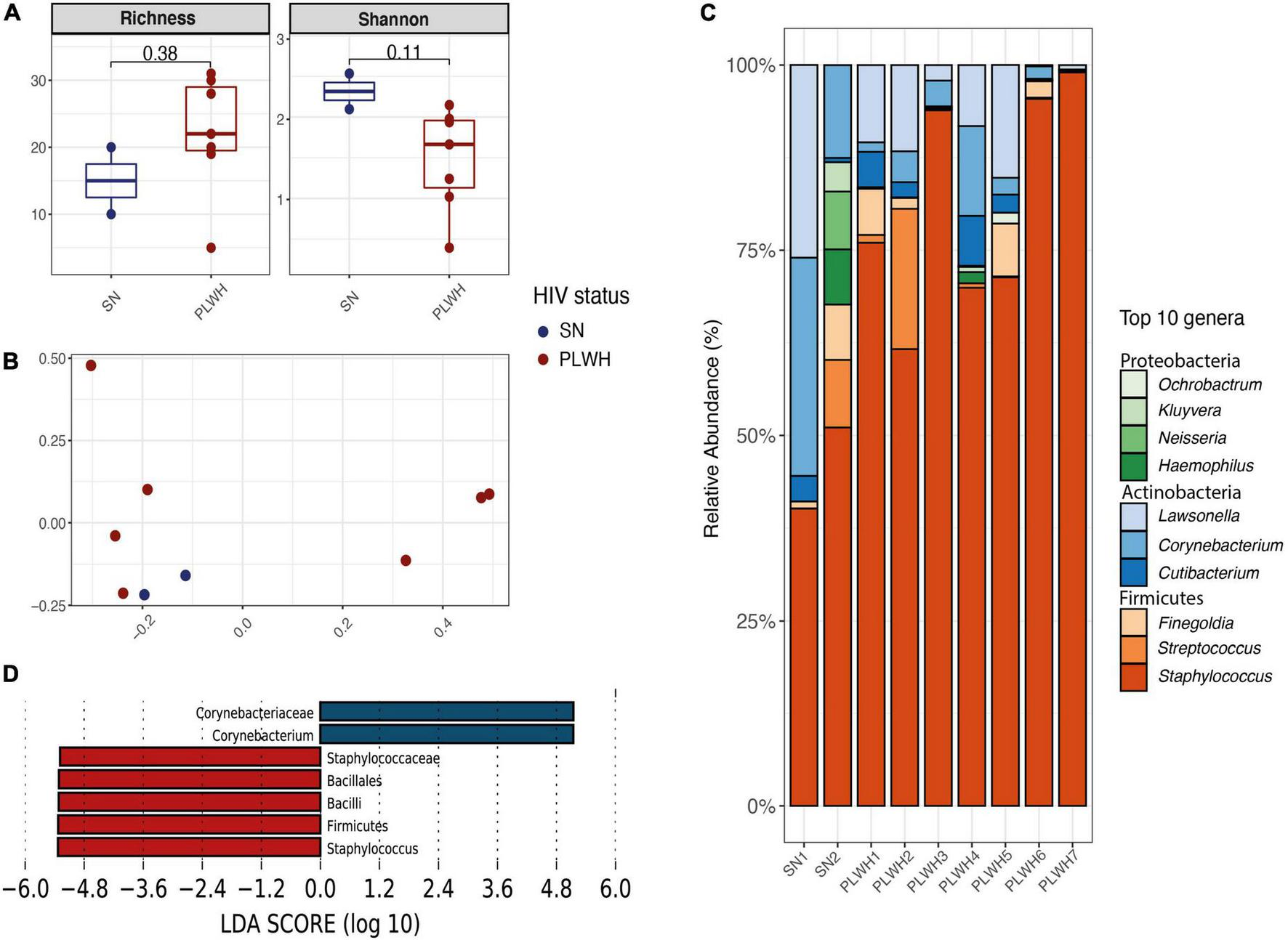 Diversity and bacterial communities of the nasopharynx of PLWH and SN. (A) Boxplots showing the median and interquartile range. Two alpha diversity metrics were estimated: richness (number of observed species) and shannon. Groups were compared using the Wilcoxon Rank Sum test. There were no differences between PLWH and SN. (B) Principal coordinate analysis of Bray-Curtis dissimilarity, constructed from the ASV table. Samples were clustered according to their HIV status. Samples did not cluster by HIV status (PERMANOVA p = 0.407). (C) Taxa barplots showing the taxonomic composition at genus level. Only the top 10 genera are represented, these account for 99.5% of all genera present. Genera are listed from the less abundant to the more abundant within each phylum, and ordered in ascending order (Proteobacteria, Actinobacteria, and Firmicutes). Color bars reflect the phyla they belong to and the intensity of the color their relative abundance, with light colors depicting the least abundant, and the darker colors the more abundant. (D) Histogram of the LDA scores revealed two differential features taxa by HIV status: Corynebacterium was found enriched in SN while Staphylococcus enriched in PLWH. LEfSe analyses were performed with LDA values of 4.0 or higher. HIV, human immunodeficiency virus; LDA, linear discriminant analysis; LEfSe, linear discriminant analysis effect size; PCoA, principal coordinate analysis; PERMANOVA, permutational multivariate analysis of variance; PLWH, people living with HIV; and SN, seronegative.