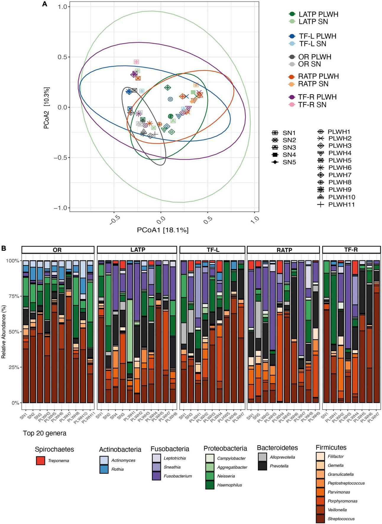 Diversity and bacterial communities of the oropharynx and oral cavity in PLWH and SN. (A) Principal coordinate analysis of Bray-Curtis dissimilarity, constructed from the ASV table. Samples were clustered and painted according to their HIV status and the anatomical site. Samples did not cluster by HIV status (PERMANOVA p = 0.115). Each symbol represents a subject. Ellipses were added to visualize the bacterial communities at each anatomical site by HIV status. Two ellipses (RATP SN and TF-R SN) are missing given the low number of subjects within each group. (B) Taxa barplots showing the taxonomic composition at genus level. Only the top 20 genera are represented, these account for 91.49% of all genera present. Genera are listed from the less abundant to the more abundant within each phylum, and ordered in ascending order (Spirochetes, Actinobacteria, Fusobacteria, Proteobacteria, Bacteroidetes, and Firmicutes). Color bars reflect the phyla they belong to and the intensity of the color their relative abundance, with light colors depicting the least abundant, and the darker colors the more abundant. HIV, human immunodeficiency virus; LATP, left anterior tonsillar pillar; PCoA, principal coordinate analysis; PERMANOVA, permutational multivariate analysis of variance; OR, oral rinse; PLWH, people living with HIV; SN, seronegative; RATP, right anterior tonsillar pillar; TF-L, tonsillar-fossa left; and TF-R, tonsillar fossa-right.