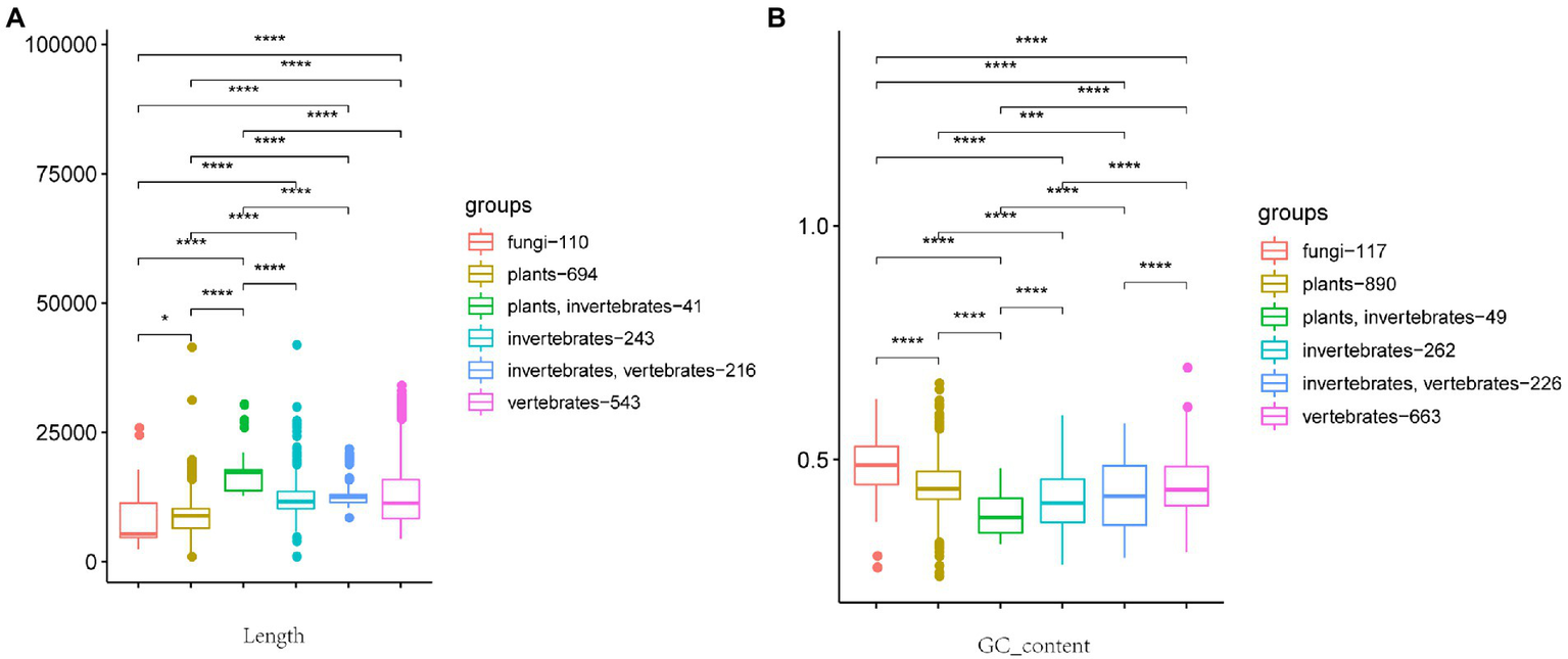 Box plot of relationship between viral genome length, GC content, and host. (A) Relationship between viral genome length and host. (B) Relationship between GC content and host. The host from left to right is fungi, plants, plants + invertebrates, invertebrates, invertebrates + vertebrates, and vertebrates. The number after the host represents the number of viruses included in the statistics. (Wilcoxon rank-sum test, *p ≤ 0.1, ****p ≤ 0.0001.)