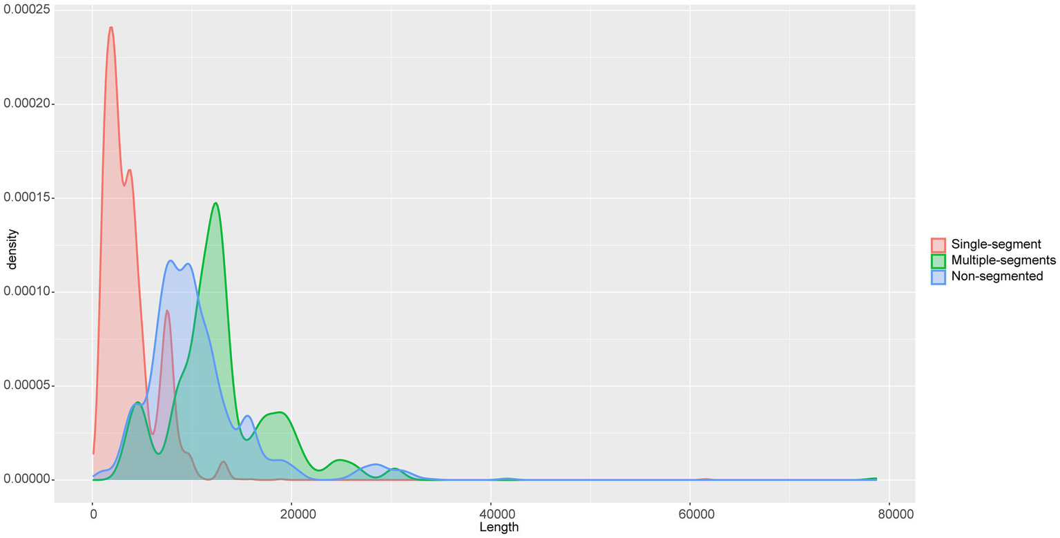 Density plot of genome lengths between single-segment, multiple-segments, and non-segmented viruses. The horizontal axis is the length of the viral genome.