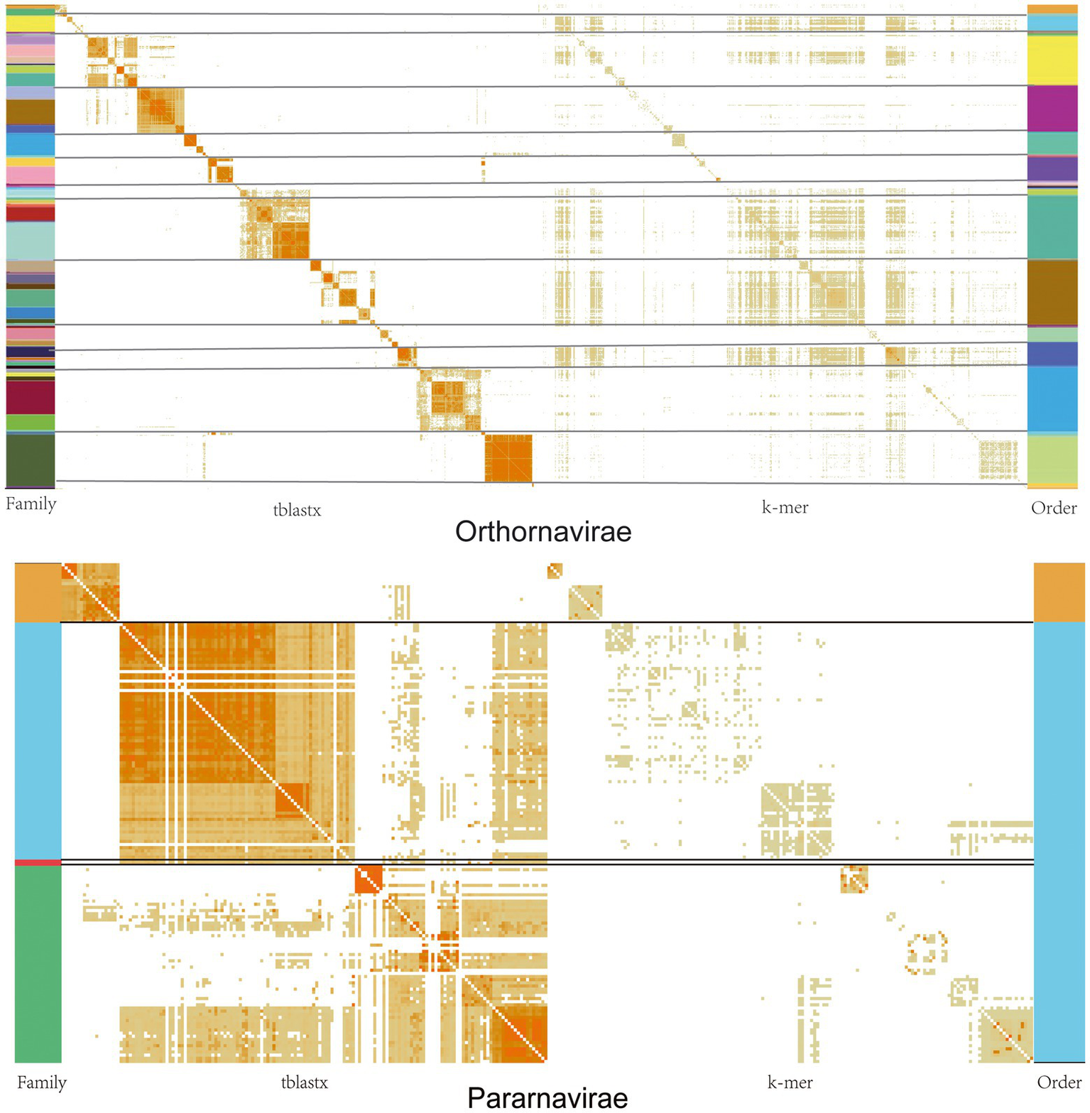 Similarity matrices of viral genomes at the nucleic acid and protein levels in the Orthornavirae and Pararnavirae. The darker the orange in the figure, the greater the similarity. The different colors on the left represent the classification of different families, and the different colors on the right represent different orders.