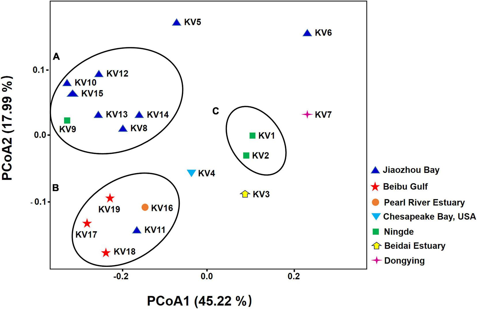 The PCoA plot was performed to visualize similarity and difference of bacterial composition among different samples at the feature level (sequences clustered at 100% sequence similarity). Notably, the samples did not cluster according to their geographic origins (Figure 2). Six (KV8, KV10, KV12, KV13, KV14, KV15) of the 8 strains from Jiaozhou Bay (Shandong Province, China) and one (KV9) from Ningde (Fujian Province, China) formed cluster A. Two strains (KV1 and KV2) from Ningde (Fujian Province, China) formed cluster C. All the 3 strains from Beibu Gulf (Guangxi Province, China), one strain (KV16) from Pearl River Estuary (Guangdong Province, China), and one member (KV11) from Jiaozhou Bay (Shandong Province, China) formed cluster B (Figure 2). The remained 5 samples exhibited indiscernible affiliation with one another (Figure 2).