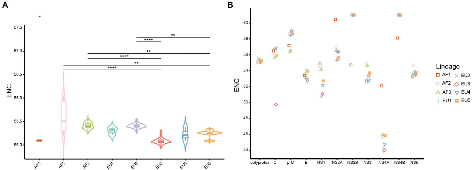 The effective number of codons (ENC) values distribution. (A) The violin plots with inner boxplots showed the ENC values of polyproteins of USUV in different lineages. Horizontal lines of inner boxplots represent median values, with whiskers extending to the farthest data point within a maximum of 1.5 × interquartile range. Benjamini-Hochberg (BH)-corrected Dunn’s test was performed to infer the significance between lineages. All differences with p < 0.05 are indicated. **p < 0.01; ***p < 0.001; ***p < 0.0001. (B) The scatter plot shows the mean ENC values of individual coding sequences of USUV, considering the lineage classification of strains. The lineages are indicated by distinct scatter shapes and colors.