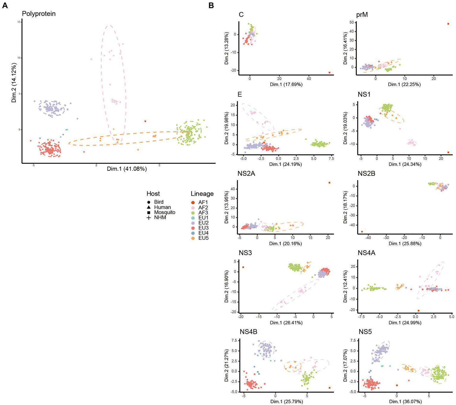 PCA analysis was performed to explore the synonymous codon usage variations among the USUV isolates. The first and second axes accounted for 41.08% and 14.12% of the total codon usage variation (Figure 4A). The strains were mainly grouped into five well-defined clusters, corresponding to 5 of 8 lineages (AF2, AF3, EU2, EU3, and EU5). The remaining three lineages were scattered probably due to their small population size. Specifically, the AF2, AF3, EU2, and EU3 lineages were grouped into distinctly separate clusters. However, the 95% confidence ellipse of the EU5 lineage had a few overlapping with that of the AF2 and AF3 lineages. The AF1 did not closely group with any clusters/lineages. In addition, we also performed PCA of individual genes based on lineages and hosts (Figure 4B). The unique codon usage of the AF1 lineage is retained in all genes. Instead, the distinctly separated clusters of the five lineages were kept in some genes such as E and NS5, whereas much more overlapping tendencies were found in the other genes such as C and NS2B. All above, these results reconfirm a lineage-specific codon usage of USUV and suggest a common ancestry, but the independent and varied divergence history at the levels of individual genes.