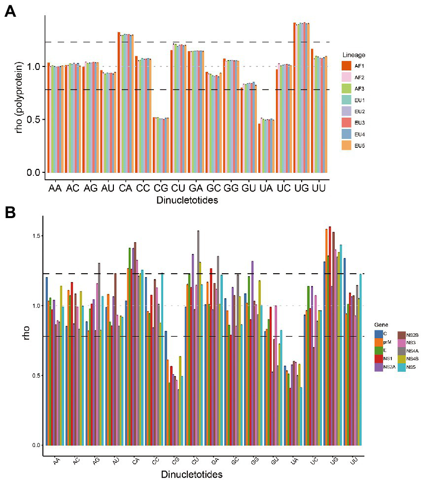 To determine the potential effect of dinucleotide frequencies on codon usage, the relative abundances of the 16 dinucleotides were calculated. The relative abundance of dinucleotides was found to be not random. Dinucleotides CpA and UpG were over-represented (rho ≥ 1.23), whereas dinucleotides CpG and UpA were under-represented (rho ≤ 0.78) in the complete coding sequences of the eight USUV lineages (Figure 5A). Dinucleotides CpU was marginally over-represented, especially in the AF2-3 lineages. Meanwhile, the relative abundance of every dinucleotide varied among different lineages. For example, the rho of dinucleotide UpC was less than 1 in AF1 but greater than 1 in the other lineages. These results indicated that eight lineages of USUV had a unique and biased dinucleotide usage pattern.