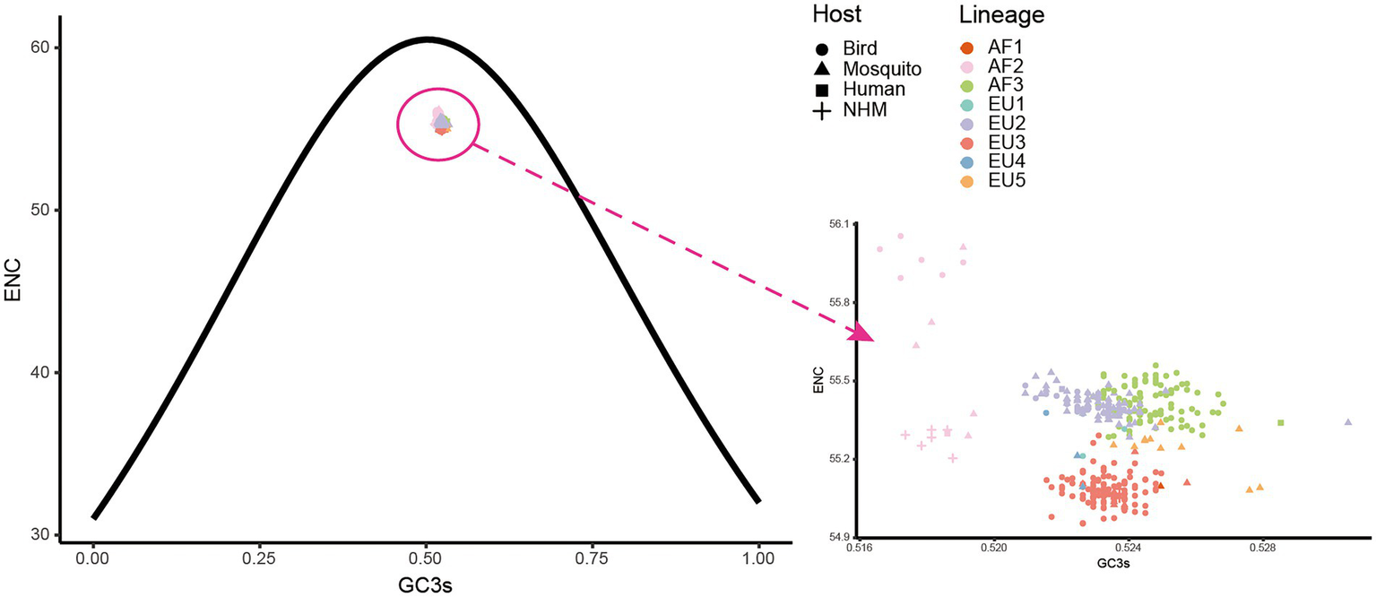 The effective number of codons (ENC) plot of whole coding sequences of USUVs. The solid curve represents the expected ENC values when the codon usage was only influenced by the GC3s composition. The point shape and color are depicted according to isolation host and lineage classification.