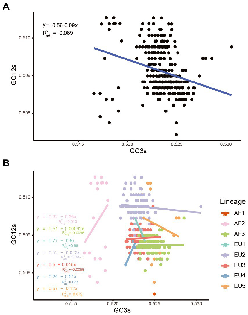 Once we recognized that both natural selection and mutation pressure contributed to the CUB of the USUV, a neutrality analysis was conducted to determine the magnitude of the two forces. Regarding complete coding sequences, neutrality analysis showed a low but significant correlation between GC12s and GC3s values among all the strains (R2adj = 0.069, p < 0.0001). The slope of the regression line was inferred to be-0.09, according to which mutation pressure (relative neutrality) was 9% and natural selection (the relative constraint on GC3s) was 91% (Figure 7A), indicating the principal effect of natural selection on the codon usage of USUV. Based on individual lineages analyses, the slopes of linear regression were 0.36, 0.00092, −0.5, −0.023, 0.015, 0.51, and −0.12 for the AF2-3 and EU1-5 lineages, respectively (Figure 7B). Therefore, the mutation pressure accounted for 36%, 0.092%, 50%, 2.3%, 1.5%, 51%, and 12%, whereas natural selection accounted for 64%, 99.908%, 50%, 97.7%, 98.5%, 49% and 88% in the corresponding lineages, respectively. The AF1 lineage had no linear regression result due to its single population size. Although mutation pressure explained 50% and 51% in the EU1 and EU4 lineage, respectively, all the correlations were not statistically significant in the seven lineages (p > 0.2392). These results reaffirmed the dominant influence of natural selection.