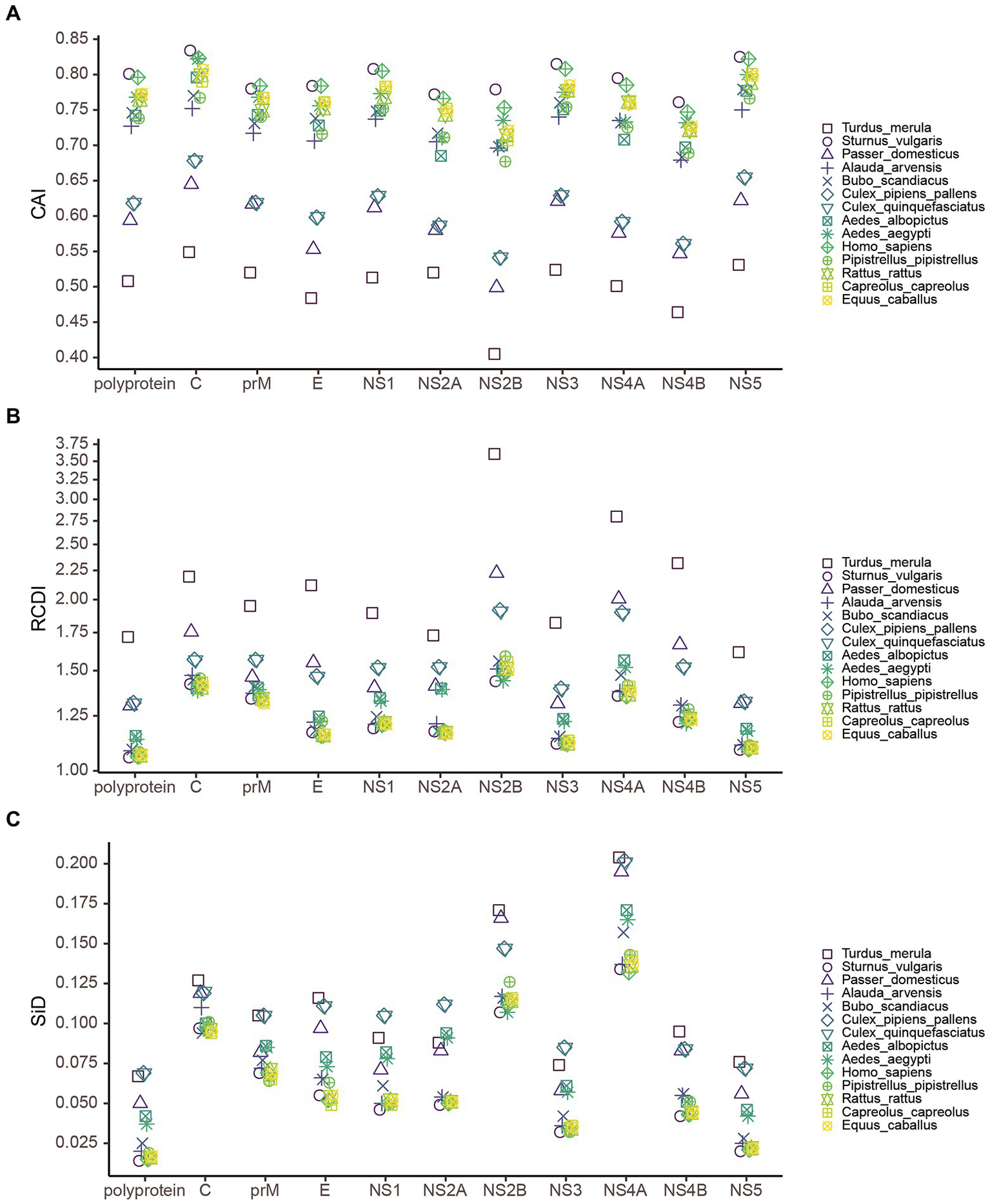The measure of overall USUV adaption to various potential hosts. (A) Codon adaption index (CAI), (B) Relative codon deoptimization index (RCDI), and (C) The similarity index (SiD) analysis of the codon usage between USUV coding sequences and their hosts. Different reference hosts are depicted in distinct shapes and colors.