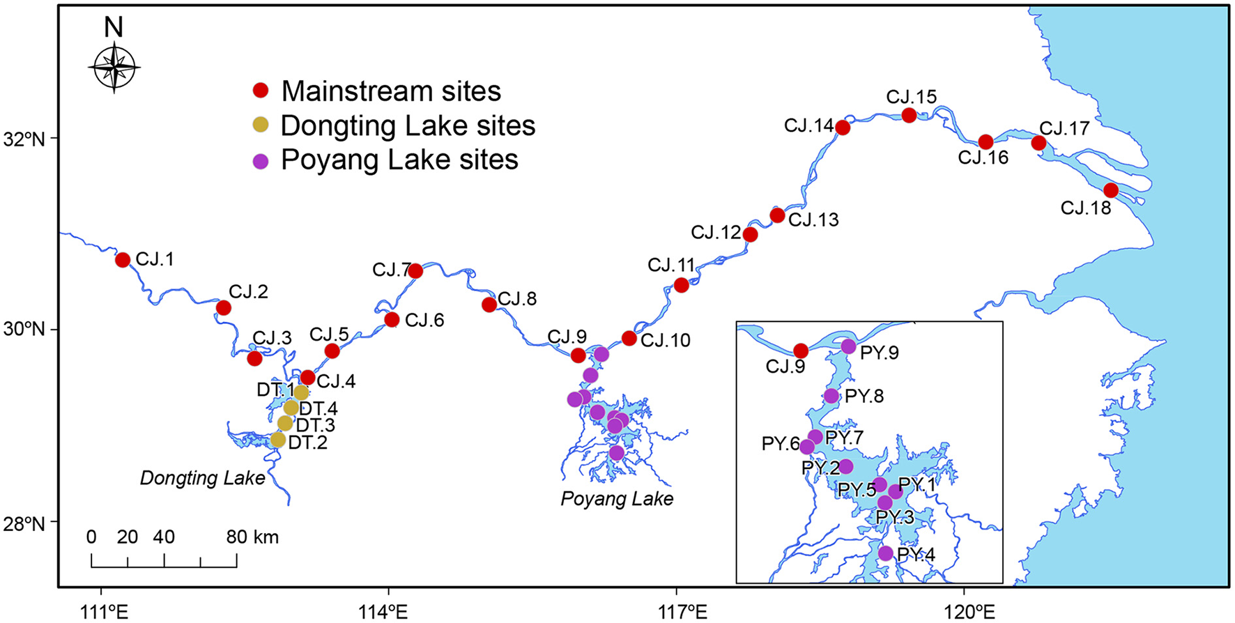 Sampling sites of this study. A total of 93 samples were collected at 31 sampling sites in the Yangtze River covering the middle and lower reaches of ~1,000 km, as well as its two major adjoining lakes (Dongting Lake and Poyang Lake). The 18 sites in the Yangtze River mainstream were divided geographically into three sections by Dongting Lake and Poyang Lake: MS1 (four sites: CJ.1–CJ.4), MS2 (five sites: CJ.5–CJ.9) and MS3 (nine sites: CJ.10–CJ.18). The map showed drainage during the dry season when our samples were collected (Nov–Dec 2017).