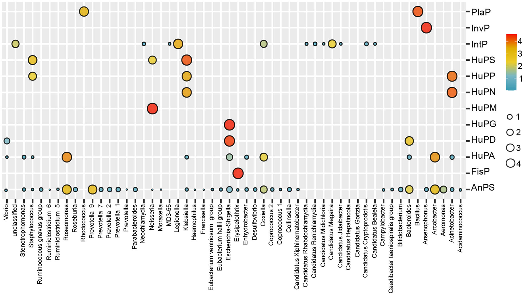 Bubble map showing the distribution of potential pathogenic groups in each pathogenic genus. AnPS, animal parasites or symbionts; IntP, intracellular parasites; InvP, invertebrate parasites; HuPA, human pathogens all; HuPD, human pathogens diarrhea; HuPG, human pathogens gastroenteritis; HuPM, human pathogens meningitis; HuPN, human pathogens nosocomia; HuPP, human pathogens pneumonia; HuPS, human pathogens septicemia; PlaP, plant pathogen; FisP, fish parasites.