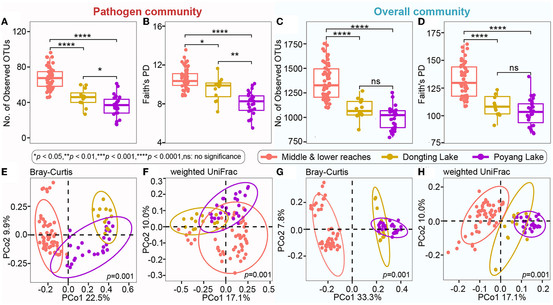 Microbial alpha diversity and composition of the pathogen and overall communities among different sections. (A–D) Number of observed OTUs and Faith's PD (phylogenetic diversity) indices in the pathogen community and overall community. The asterisk represents a significant difference between the two groups, *p < 0.05, **p < 0.01, ****p < 0.0001, ns: no significance. (E–H) Unconstrained PCoA with Bray-Curtis and weighted UniFrac distances that separated by different sections (p = 0.001, permutational multivariate analysis of variance by Adonis).