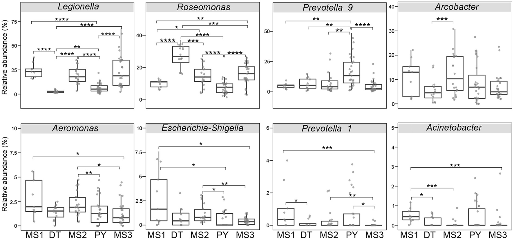 Relative abundance of major abundant pathogen genera in different sections. The asterisk represents a significant difference between the two groups, *p < 0.05, **p < 0.01, ***p < 0.001, ****p < 0.0001. DT, Dongting Lake; PY, Poyang Lake; MS, mainstream.