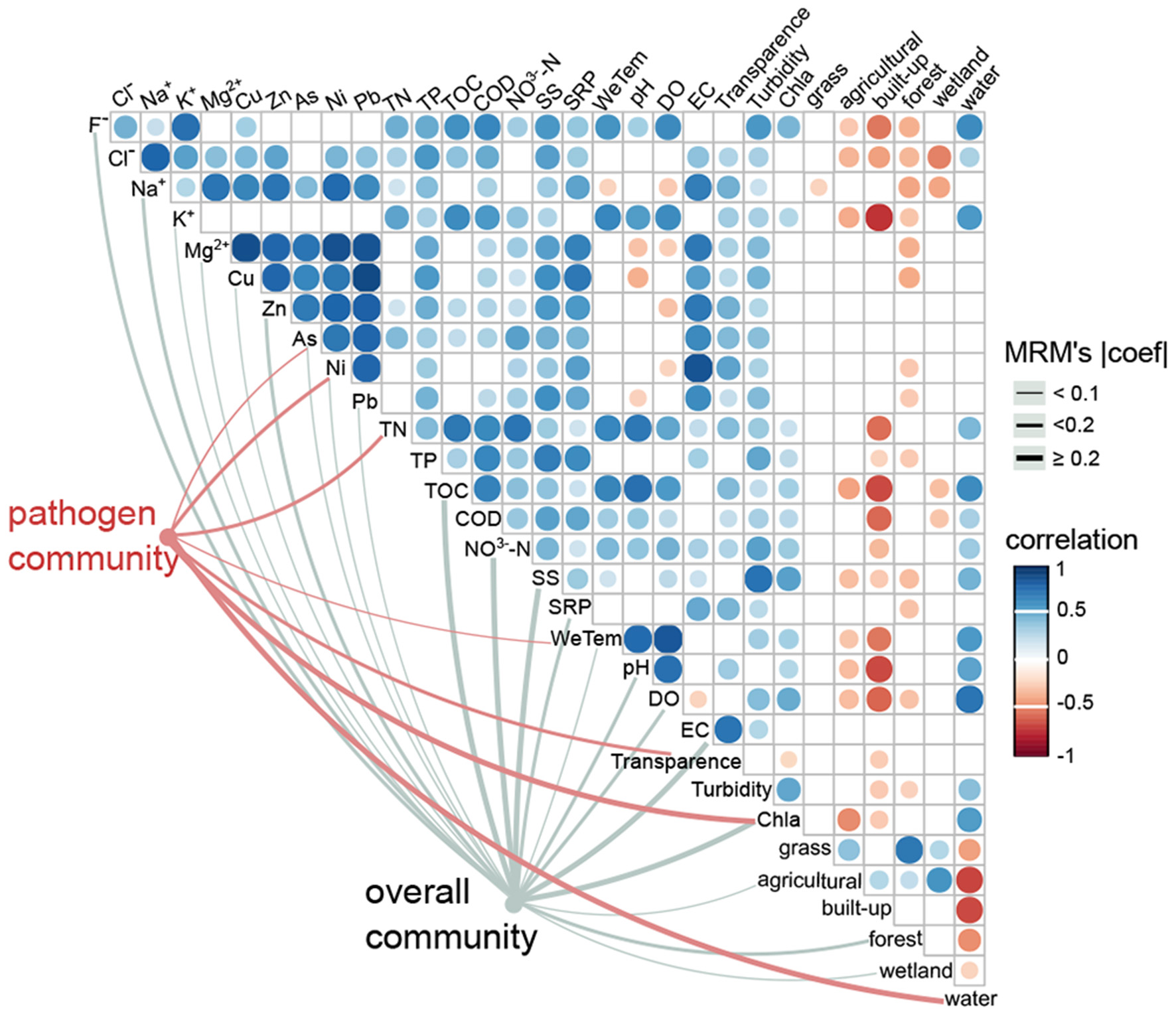 Effects of environmental drivers on the pathogen community and the overall community. The associations between environmental variables and the pathogen community (red edges) and the overall community (gray edges) were tested by MRM models (p < 0.05). The edge width corresponds to the MRM's coefficient. The color gradient indicates Spearman correlations among environmental variables (p < 0.05).