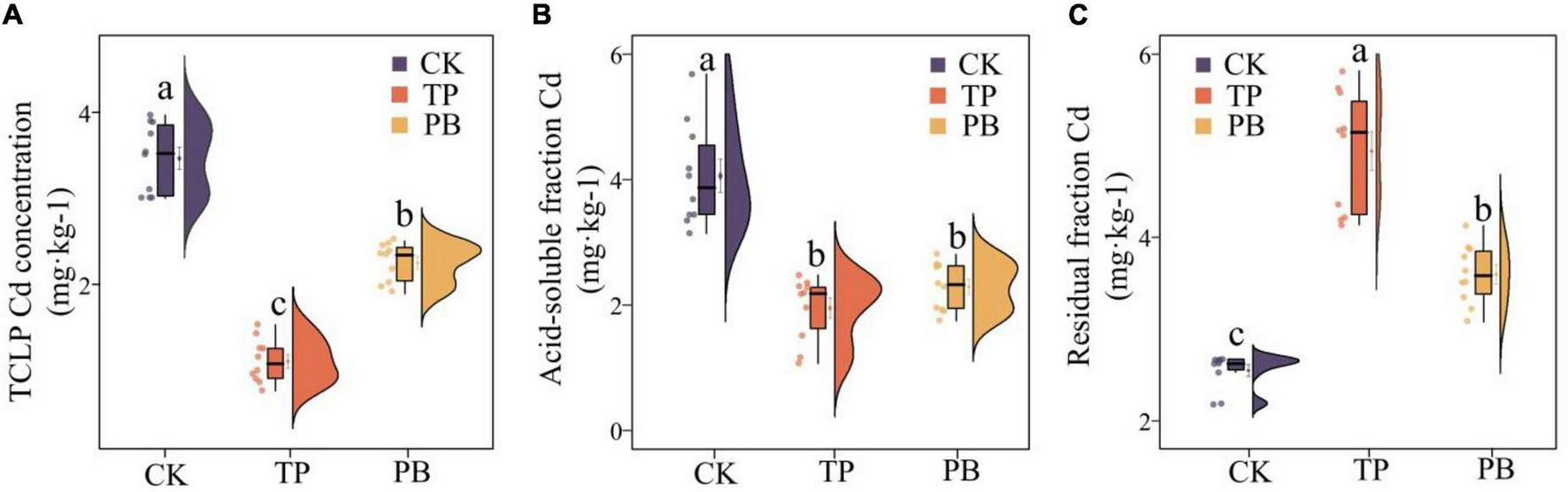 Leached cadmium (Cd) content (A) and distribution forms of Cd (B,C) in the control group (CK), poplar bark biochar (PB), and thiourea-modified poplar bark biochar (TP) soil treatment groups. Different letters indicate the values that differ significantly among CK, PB, and TP treatments at p < 0.05 [honestly significant difference (HSD) test].