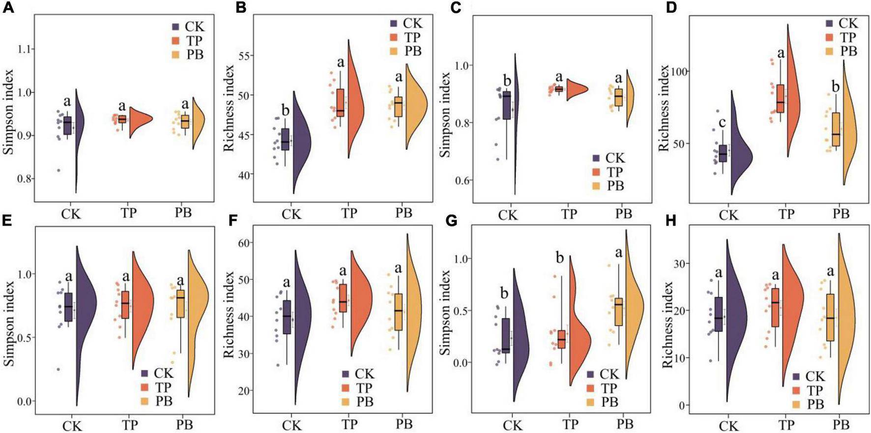 α-Diversity indices of abundant (A,B) and rare (C,D) bacterial and abundant (E,F) and rare (G,H) fungal communities in the control group (CK), poplar bark biochar (PB), and thiourea-modified poplar bark biochar (TP) treatment groups. Different letters indicate the values that differ significantly among CK, PB, and TP treatments at p < 0.05 [honestly significant difference (HSD) test].