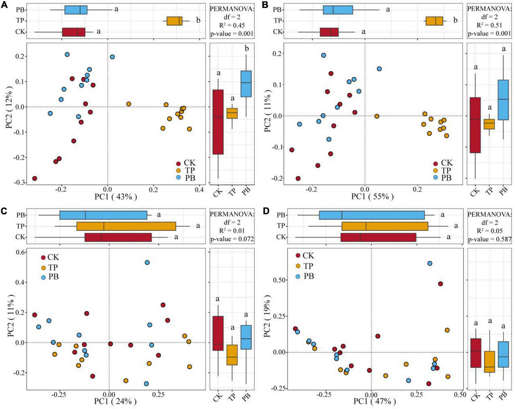 Principal coordinate analysis (PCoA) of the abundant and rare bacterial and fungal communities using Bray-Curtis distances. Different letters indicate the distribution of different treatments of samples along the PC1 and PC2 axes at p < 0.05. Abundant bacteria (A), Rare bacteria (B), Abundant fungi (C), and rare fungi (D).