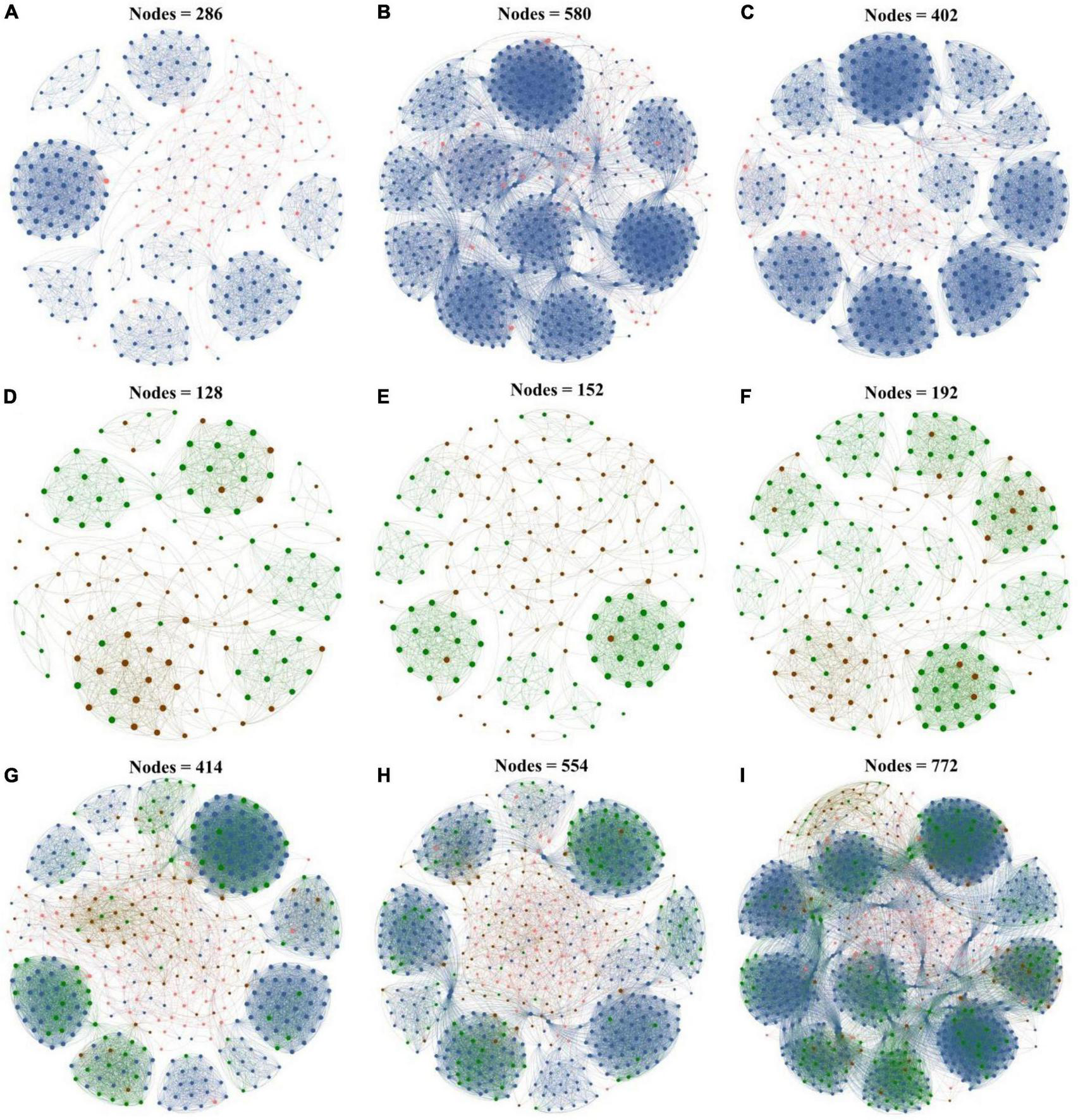 Microbial networks of the control group (CK), poplar bark biochar (PB), and thiourea-modified poplar bark biochar (TP) groups. (A–C) Rare and abundant bacterial networks; (D–F) rare and abundant fungal networks; and (G–I) rare and abundant bacterial and fungal networks. The size of a node is proportional to the degree of connectivity. Blue nodes: rare bacteria; pink nodes: abundant bacteria; green nodes: rare fungi; and brown nodes: abundant fungi.