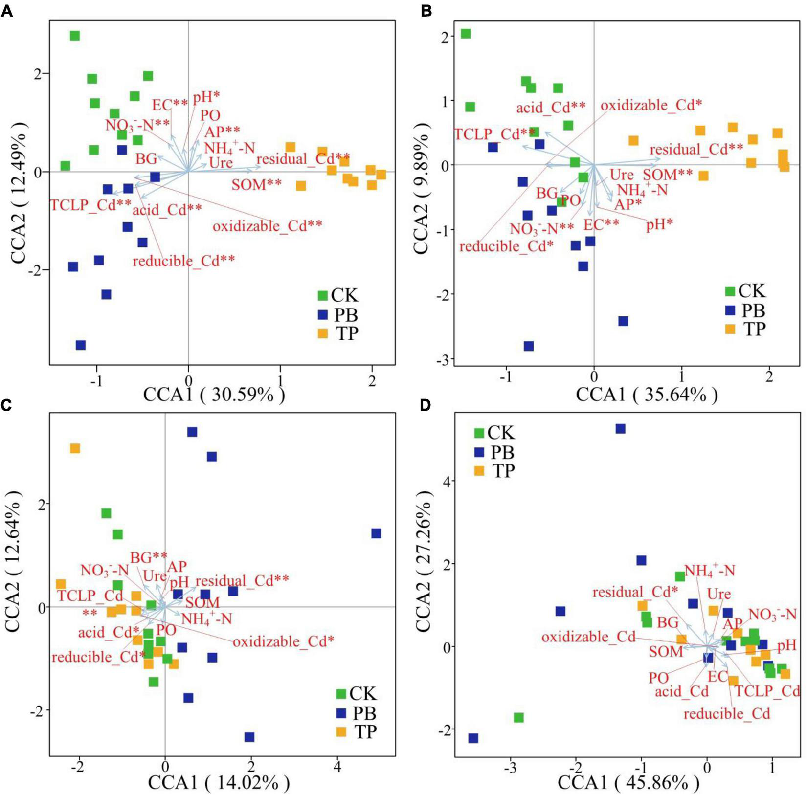 The Bray-Curtis distance-based CCA results showed that the rare and abundant bacterial taxa formed distinct and well-separated clusters in different treatment groups (Figure 6). However, the difference between the rare and abundant fungal taxa was not clear, thereby indicating that the changes in the soil properties after biochar treatment had a big difference in the impact of the rare and abundant taxa between the bacterial and fungal sub-communities. The impact on bacterial taxa was greater than that on fungi. The rare and abundant bacterial communities were mainly driven by pH, EC, SOM, AP, available nitrogen (AN), leached Cd content, and Cd forms. For fungi, BG, leached Cd content, and various forms of Cd were significantly associated with the changes in the abundant taxa. In the figure, the length of the arrow shows that the factor that showed the greatest influence on the number of soil microbial ASVs was the residual Cd. In addition, the sample points of the PB and TP treatments formed obtuse angles with the leached Cd, but acute angles with the residual Cd, indicating that the biochar treatment could help to reduce the leached Cd content and increase the residual Cd content.