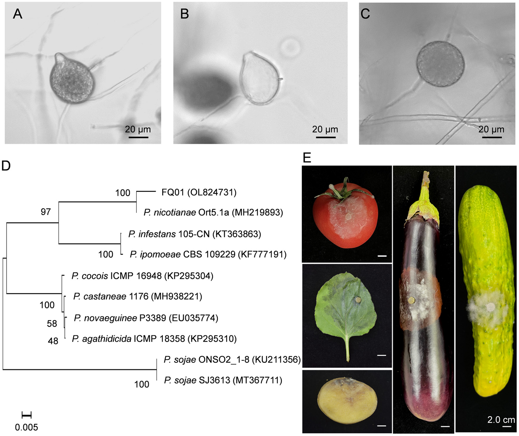 Identification of the pathogen FQ01. (A) Sporangial morphology before the release of zoospores. (B) Sporangial shell after the release of zoospores. (C) Chlamydospore morphology. (D) Phylogenetic tree of the pathogen FQ01 and other Phytophthora strains based on a neighbor-joining analysis of ITS sequence. (E) Symptoms of plant diseases caused by P. nicotianae FQ01 infection.