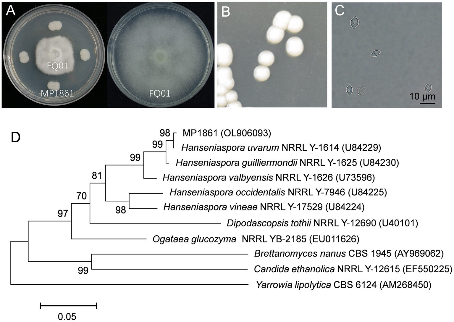 To identify the yeast strain MP1861, the colony and cell morphological characteristics were investigated. As shown in Figure 2B, the colonies of the yeast strain MP1861 were white, round, smooth, and sticky. The cells of the yeast strain MP1861 exhibited a typical lemon shape (Figure 2C). A dendrogram based on the D1/D2 26S rDNA region of the yeast strain MP1861 (GenBank accession No. OL906093) was further constructed. According to the results of the phylogenetic analysis, the yeast strain MP1861 was identified as H. uvarum (Figure 2D).