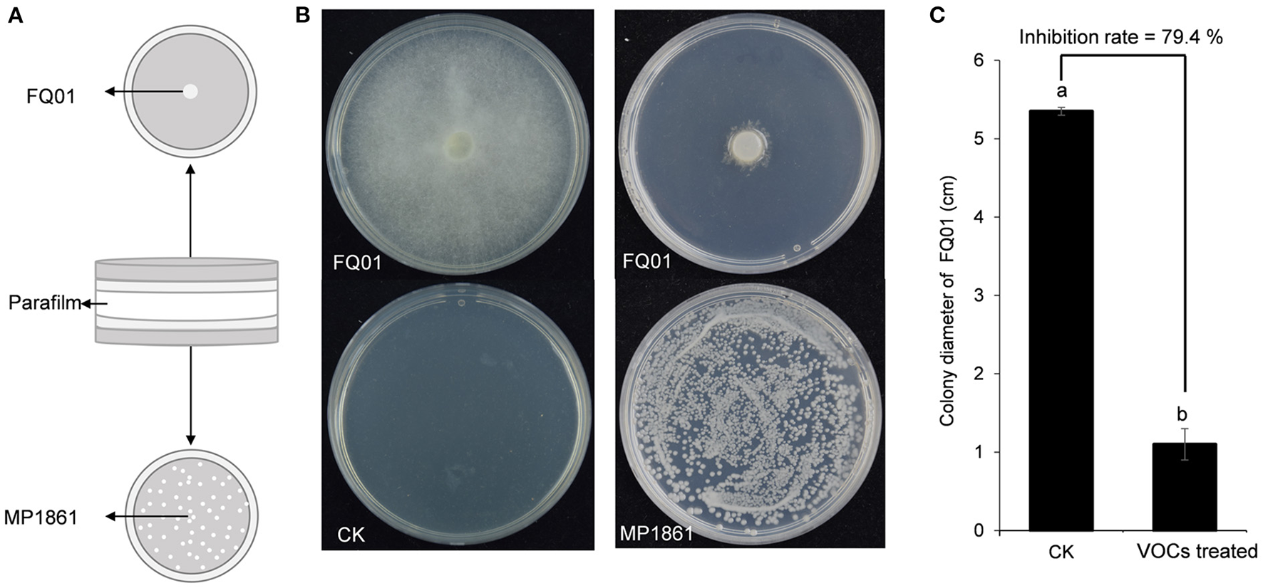 Graphical representation of VOCs released by the yeast strain MP1861 against the oomycete strain FQ01. (A) Schematic depiction of the method used in this study. (B) Mycelial growth of the pathogen FQ01 grown on PDA plates for 4 d. For the VOCs treated group, each plate was inoculated with 100 μl of yeast seed (3.0 ×104 cells/mL). (C) Colony diameter of the pathogen FQ01. Data are calculated as the mean values ± SD, n = 3. The different letters a and b on the chart indicate significant difference at the 0.05 level.