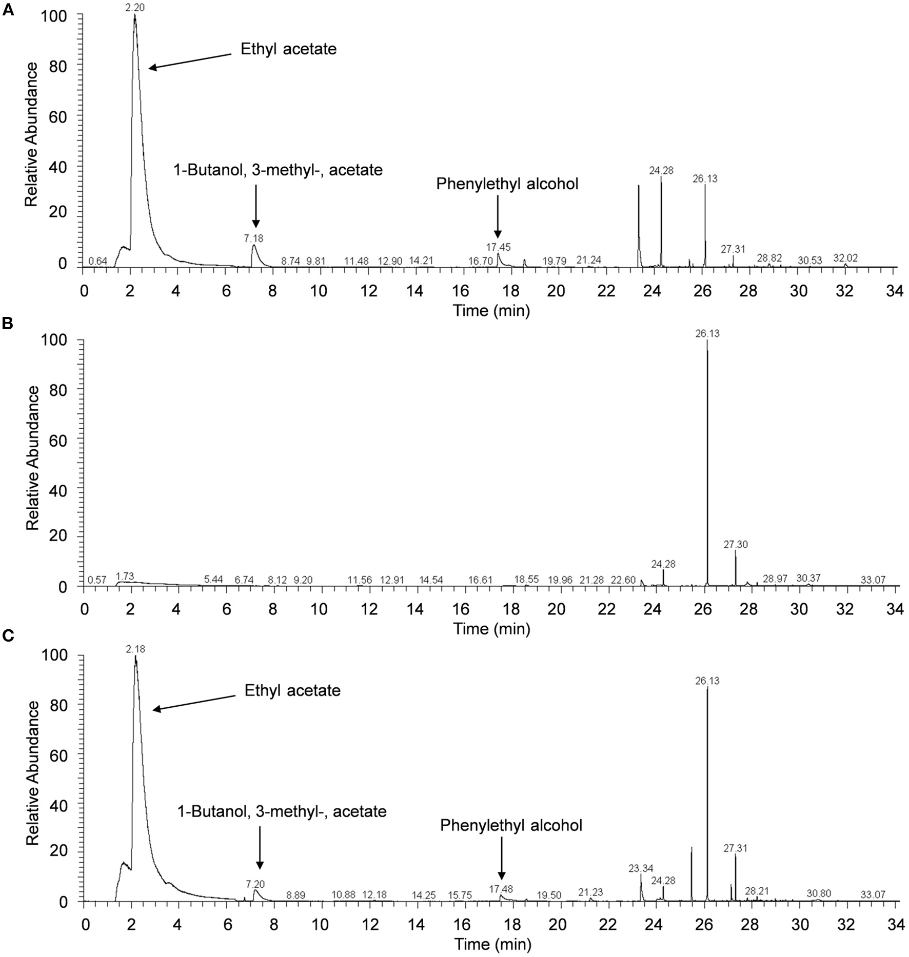 Supplementary Figure S1MS spectra of three peaks. (A) Ethyl acetate peak at 2.20 min. (B) 1-butanol, 3-methyl-, acetate peak at 7.18 min. (C) Phenylethyl alcohol peak at 17.45 min.