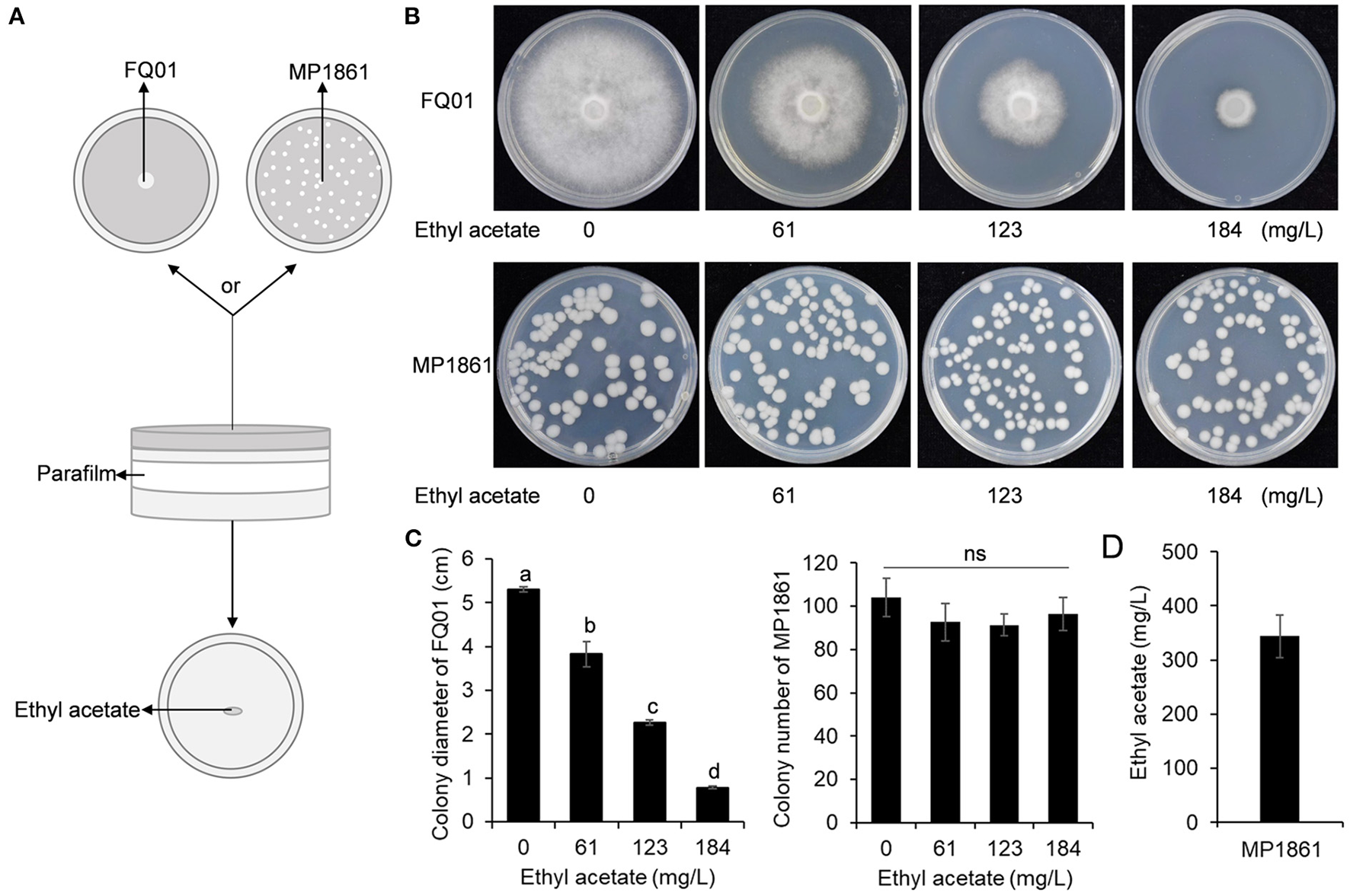 Antifungal activity of ethyl acetate in the airspace against P. nicotianae FQ01. (A) Procedure used in this study. (B) Colonies of the oomycete strain FQ01 and the yeast strain MP1861 grown on PDA plates for 4 d. (C) Colony diameter of the pathogen FQ01 and colony number of the yeast strain MP1861. Three experiments were carried out. Different letters (a, b, c, and d) labeled on the columns are significant difference at p < 0.05. Probability values of more than 0.05 were marked as ns (no significance). (D) Ethyl acetate production in the VOCs of the yeast strain MP1861.