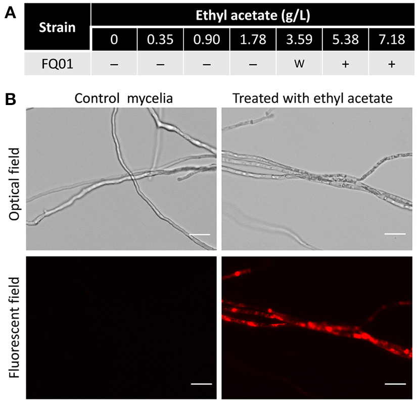 PI staining of the pathogen FQ01. (A) Effect of different ethyl acetate concentration on PI staining. –, negative; w, weak; +, positive. (B) Images of the pathogen FQ01 after PI staining. Mycelia treated with 5.38 g/L ethyl acetate. Bars represent 20 μm.