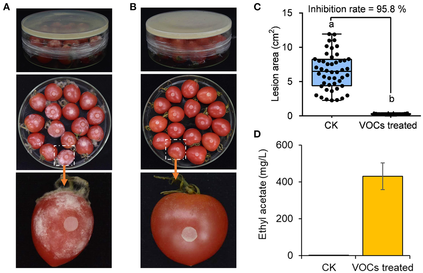 Evaluation of the efficacy of the VOCs from the yeast strain MP1861 on Phytophthora disease development. (A) Blank control group. (B) Group treated with H. uvarum MP1861 VOCs. (C) Statistics of the areas of 48 lesions on tomato fruit. Different letters, a and b, means a significant difference at the level of p < 0.05. (D) Ethyl acetate contents in the closed Petri dishes. Data are given as the mean values ± SD, n = 3.