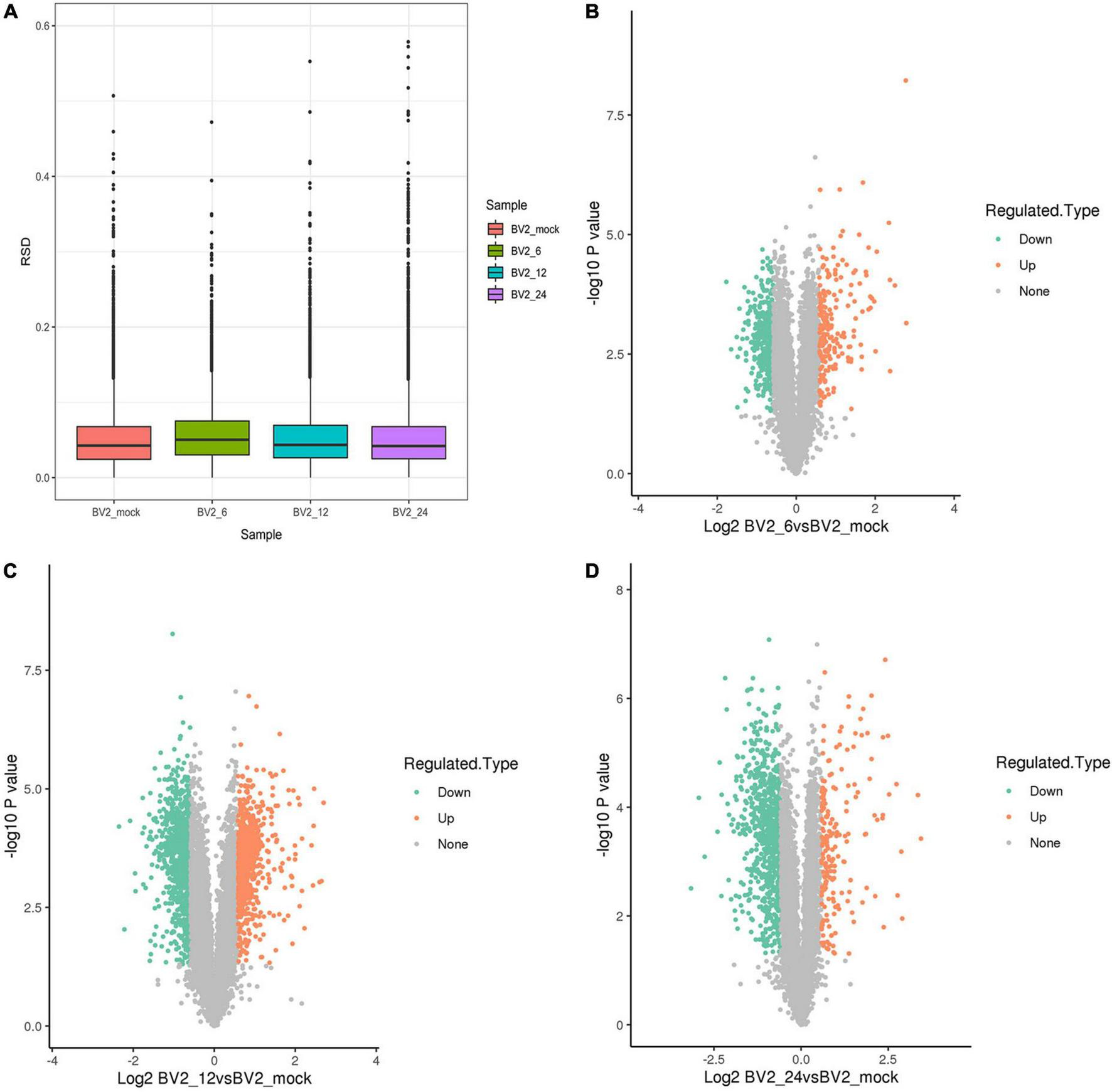 We performed a proteome-wide study of DEPs by MS in BV2 cells infected with JEV at 6 h post infection (hpi), 12 hpi, 24 hpi, and in a mock group. Boxplots were used to depict the relative standard deviation (RSD) of protein quantification data across replicates, with lower overall RSD values indicating greater quantitative reproducibility (Figure 1A).