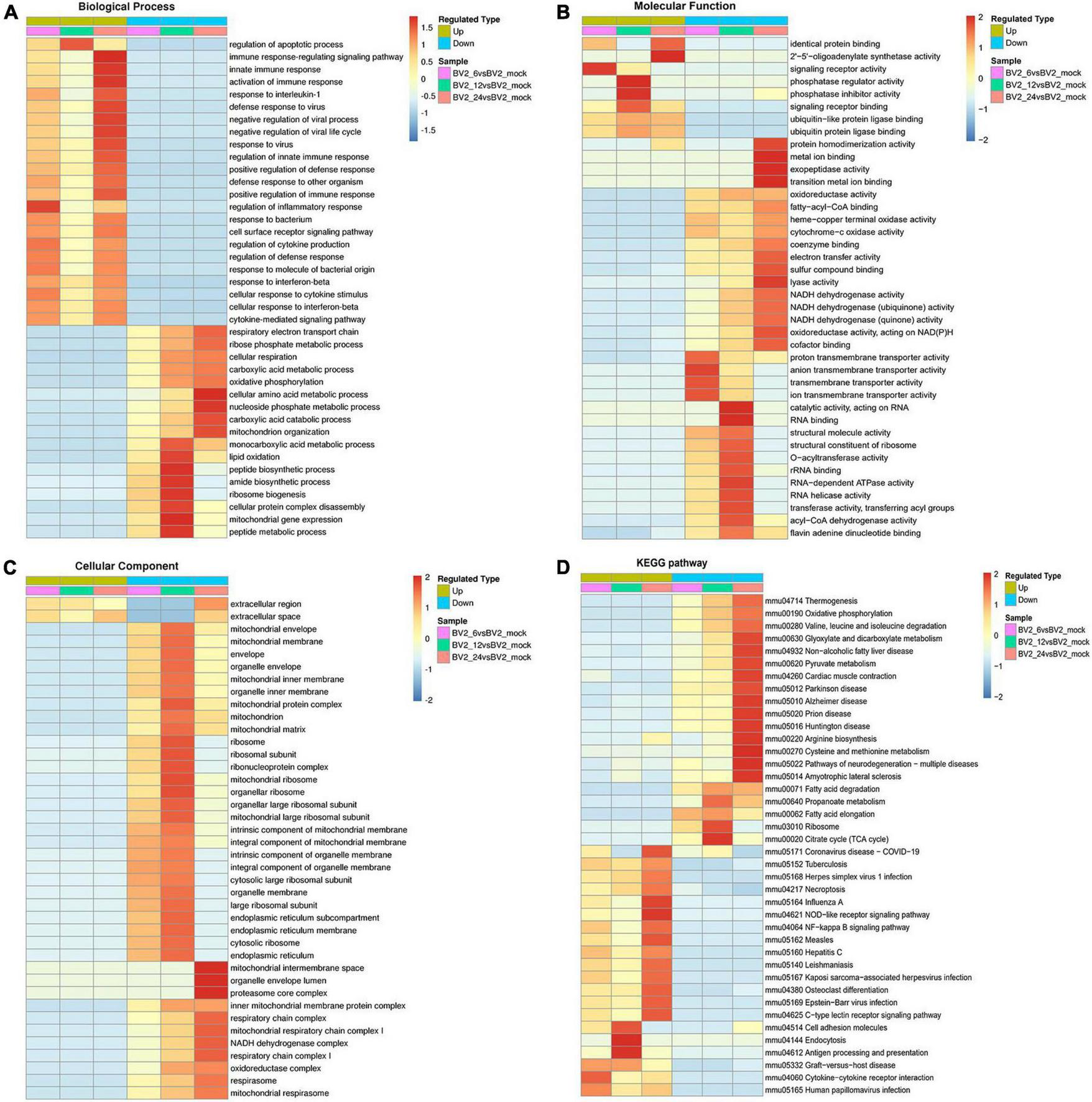 Functional enrichment of DEPs in BV2 cells after JEV infection. (A–C) Heat map of cluster analysis based on GO enrichment. (A) Biological process showing activation of multiple immune responses, indicating activation of cellular immune responses after JEV infection. (B) Molecular function showing activation associated with protein binding, suggesting that the cascade effect of the immune response is also activated. (C) The cellular component was enriched for fewer upregulated proteins and a larger number of proteins with decreased expression, thus indicating that intracellular component expression was suppressed by JEV infection. (D) Heat map of clustering analysis for KEGG enrichment. Infectious disease pathways were activated, while the expression of proteins related to autoimmune disease-related pathways was decreased. Cell adhesion molecules, along with antigen processing and presentation pathways, were highly enriched at 12 h. All enriched proteins were significantly different, with a red to blue gradient indicating higher to lower protein enrichment.