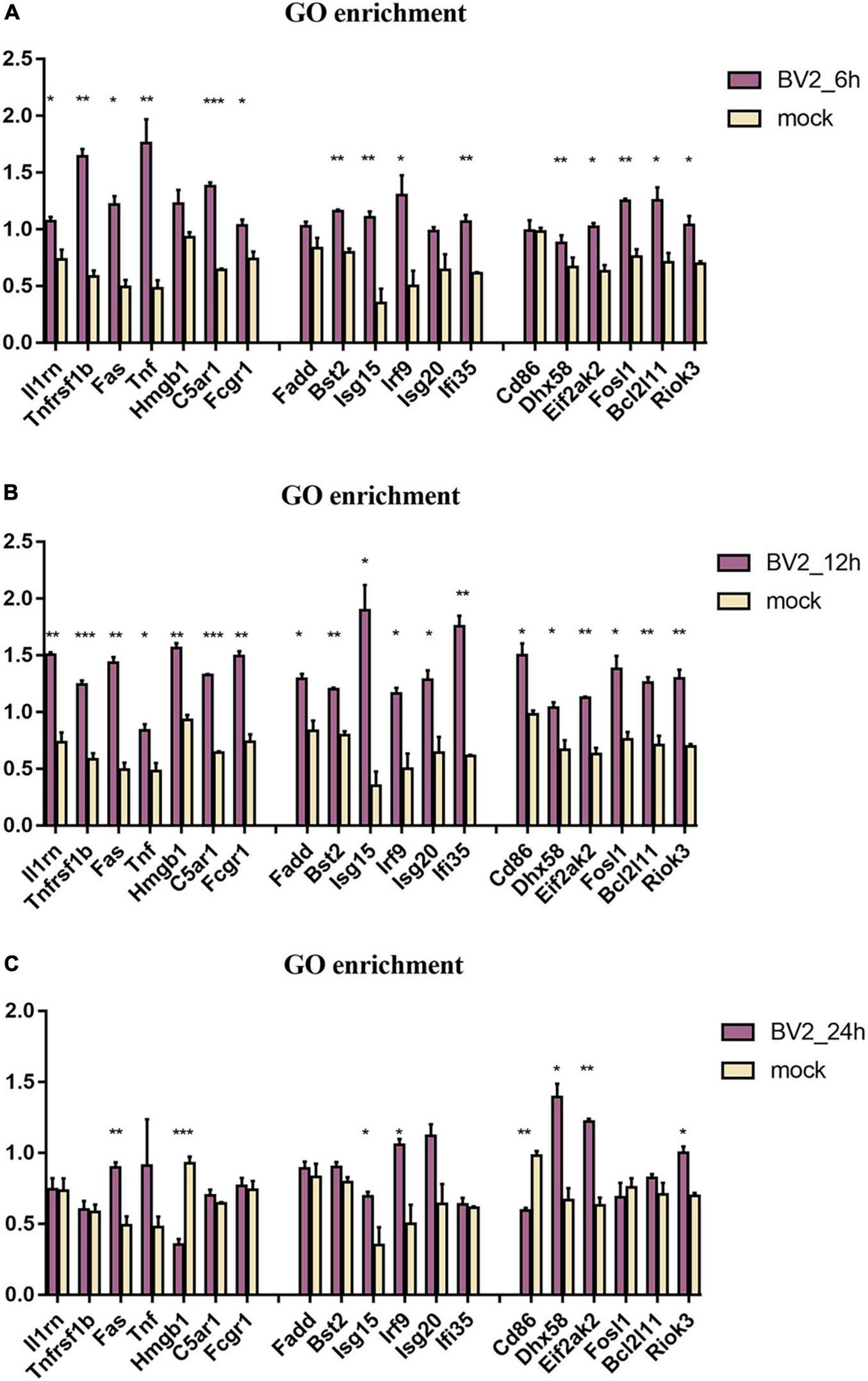 Regulation of proteins associated with immune in BV2 cells after infection with JEV at (A) 6 hpi, (B) 12 hpi, and (C) 24 hpi. Significant changes were found in the expression of inflammation-related proteins Fas, TNF, Fosl1, Hmgb1, Riok3, as well as apoptosis-related proteins Fadd, Fas, TNF, and interferon-related proteins Irf9, Isg20, Ifi35. These suggested that JEV infection induces broad immune responses, with the inflammatory response being one of the key immune responses. All the samples were tested through three parallel groups. *P < 0.05, **P < 0.01, and ***P < 0.001.