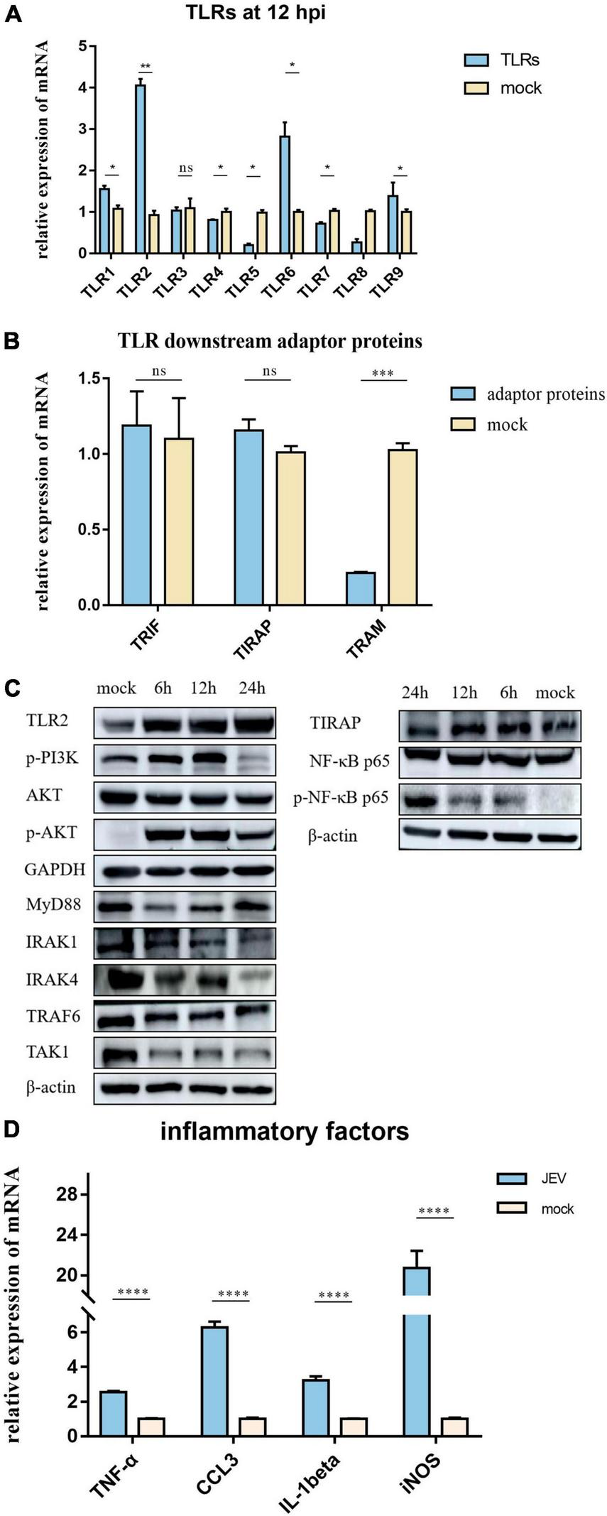 According to proteomic data, the most immune-related proteins were activated 12 h after infection. (A) Detection of TLR activation by relative mRNA level. TLR2 shows highlight expression in all TLRs; TLR2 was selected for subsequent investigation. (B) To investigate the pathway by which TLR2 exerts functionality, qPCR was performed on critical proteins downstream of TLR2; TRIF, TIRAP, and TRAM were not upregulated. (C) Two pathways downstream of TLR2 were verified by western blotting. The expression levels of PI3K-AKT and NF-κB pathway proteins were significantly upregulated; however, the MyD88 pathway, which is usually considered a TLR2 junction protein, was not activated. (D) JEV infection promoted the upregulation of inflammatory factors (TNF-α, CCL3, IL-1beta, and iNOS), thus indicating an inflammatory response. All samples were tested in three parallel groups. *P < 0.05, **P < 0.01, ***P < 0.001, and ****P < 0.0001.