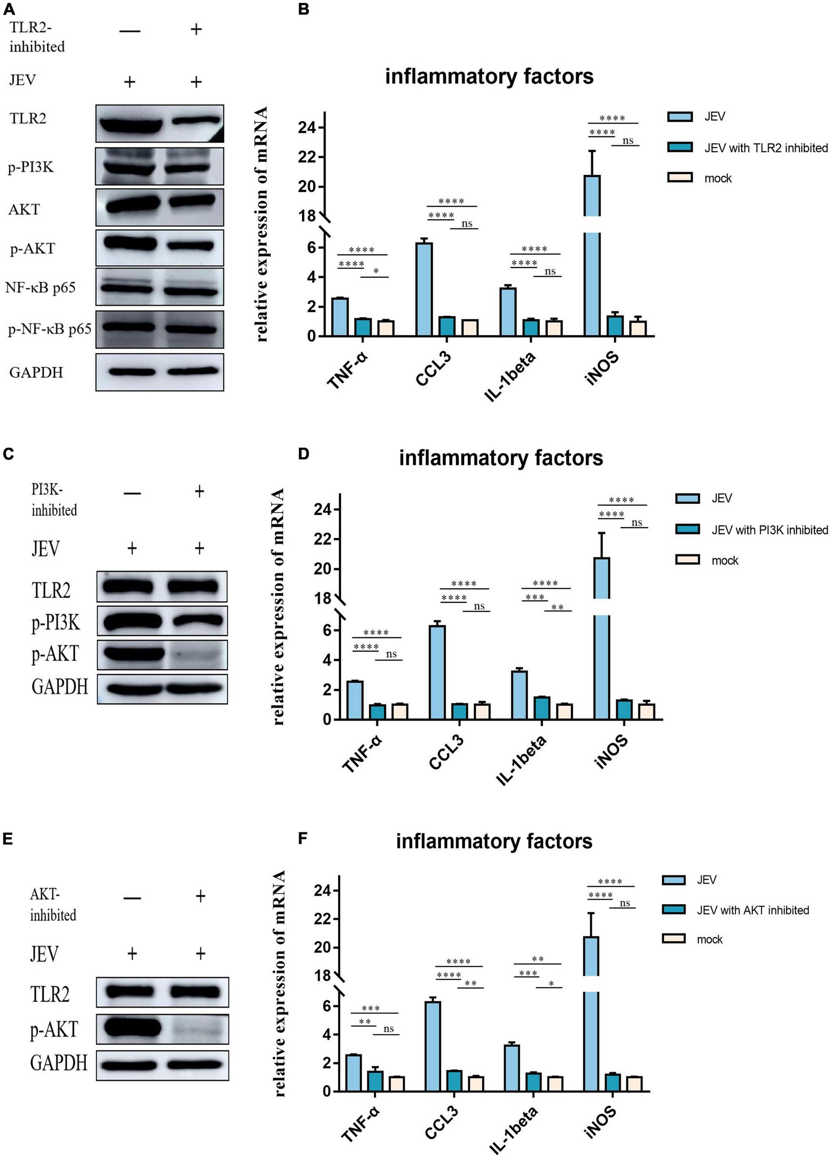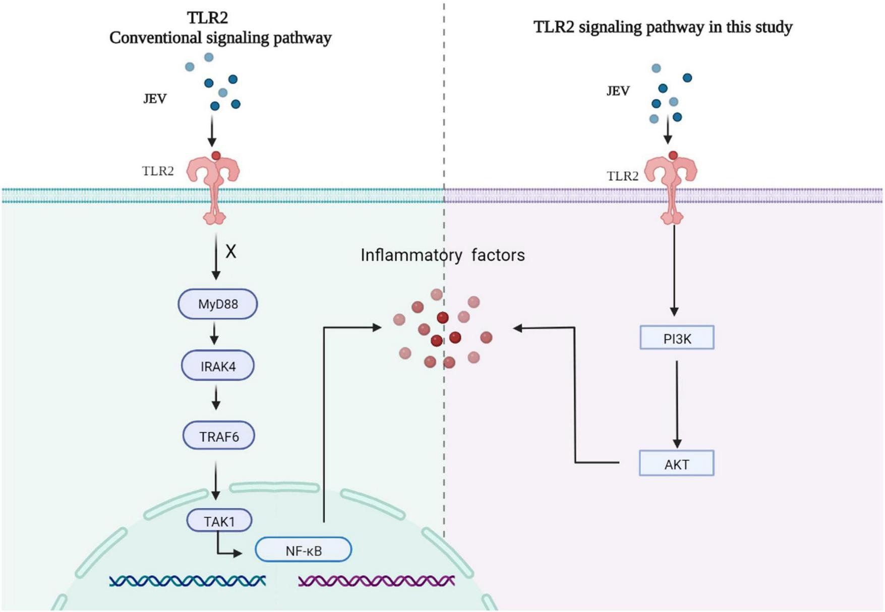 JEV infection increased the expression of key factors of the inflammatory response via the TLR2-PI3K-AKT signaling axis. The MyD88 signaling pathway downstream of TLR2 was not activated, and the NF-κB signaling pathway was not regulated by TLR2.