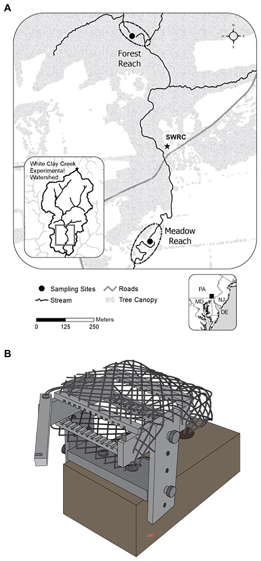 Map of the experimental locations at White Clay Creek (A) and a schematic design of a periphytometer (B).