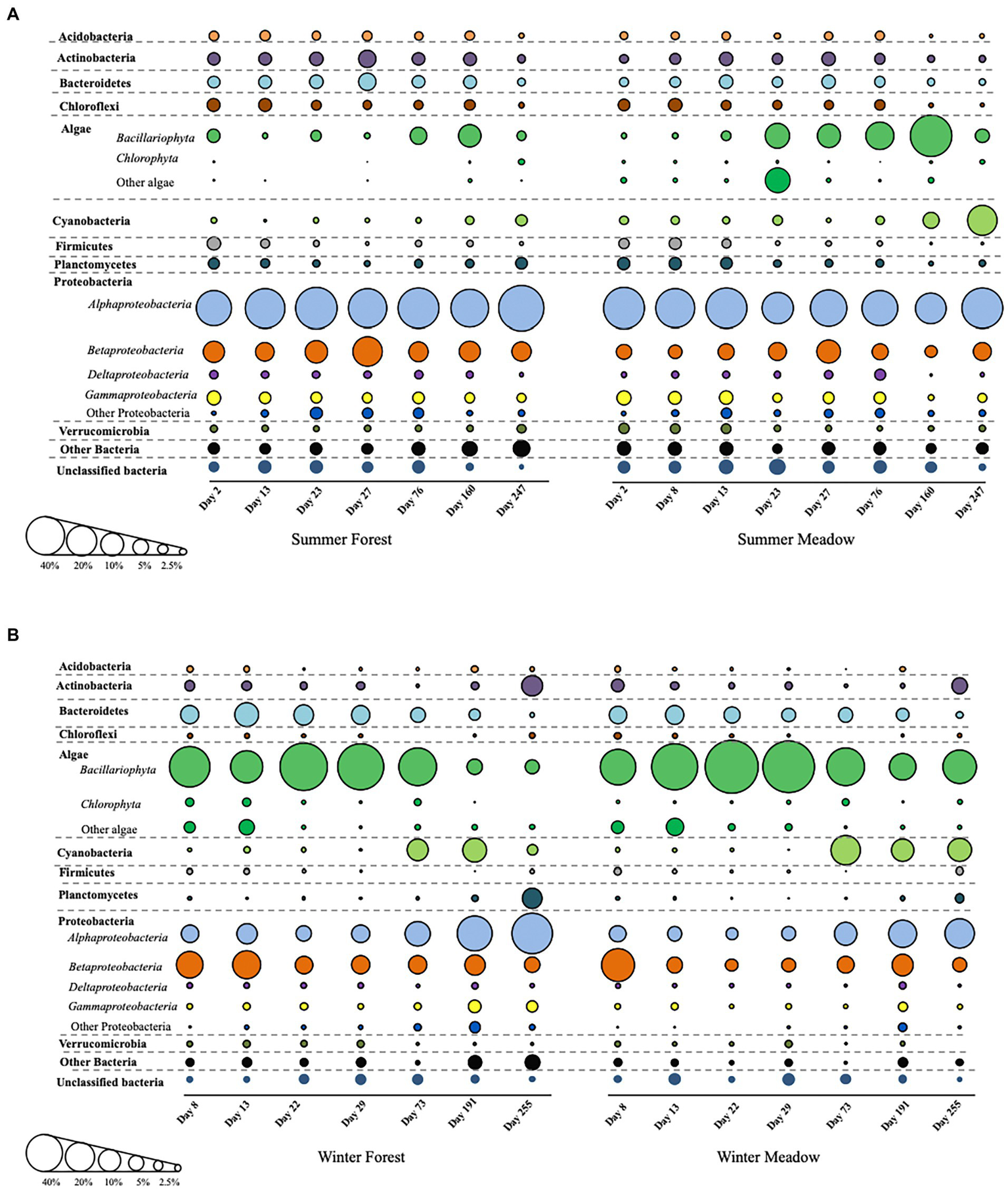 The detailed succession of periphyton community composition starting from summer (A) and winter (B). Bubble sizes are corresponding to relative abundance of each group.
