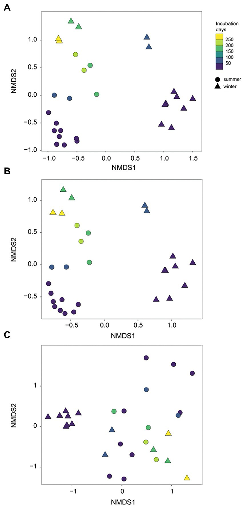 NMDS separation of periphyton communities in summer and winter succession: (A) all sequences; (B) heterotrophic bacteria only; (C) algae (chloroplast) + cyanobacteria only. Summer and winter succession are in different symbols and color gradients indicate the incubation time (days).